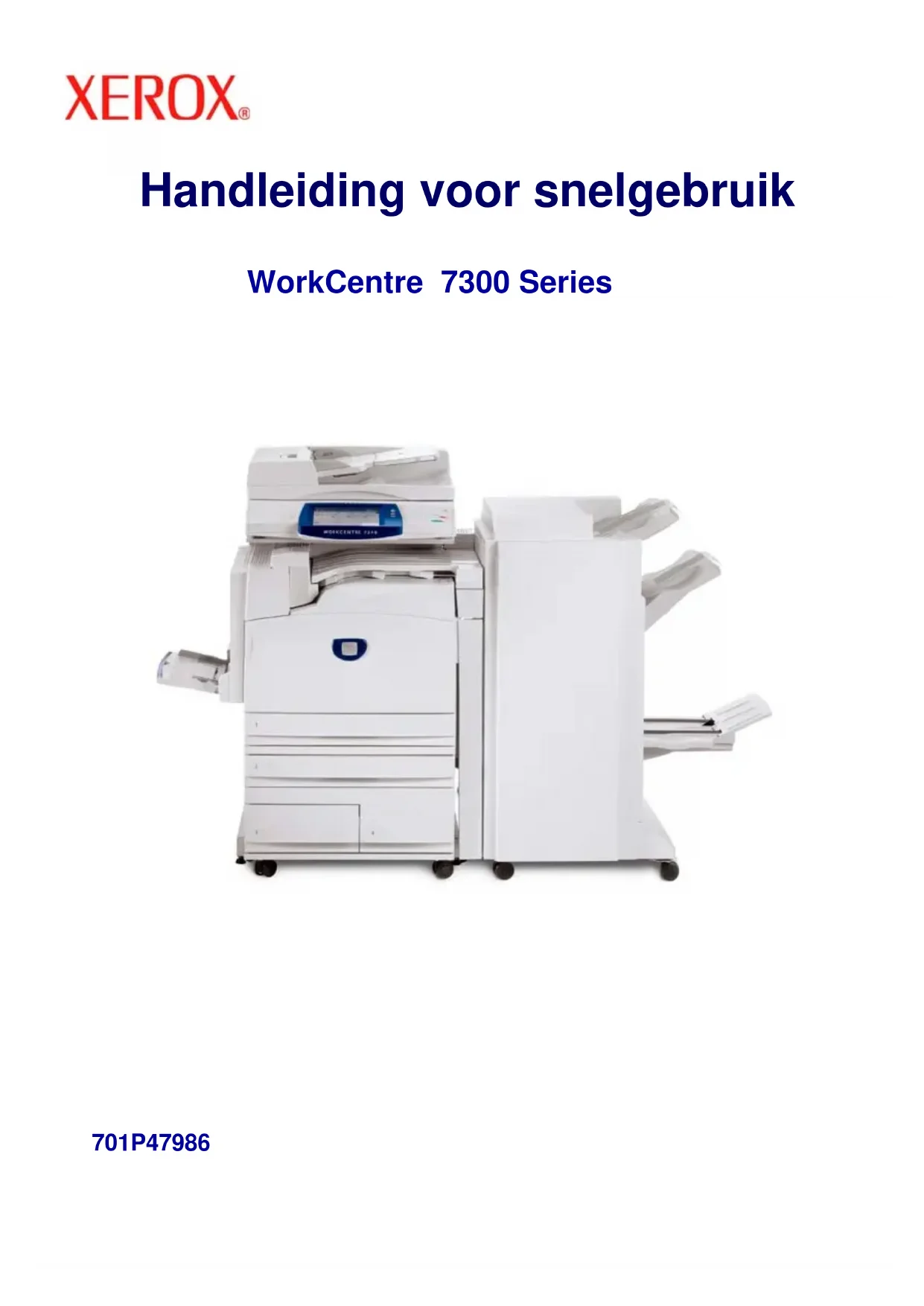 das Modul nicht richtig installiert. Modulsitz und -verriegelung prüfen. Damit sind die Erläuterungen zum Austauschen des Tonermoduls abgeschlossen. WorkCentre 7300 Series WorkCentre 7300 Series KurzübersichtHandleiding voor snelgebruik WorkCentre 7300 Series 701P47986OPMERKING: BLAUWE titels zijn voor IT-beheerders bedoeld, GROENE titels voor eindgebruikers en RODE titels geven aan dat het apparaat moet worden onderhouden. Sommige schermen van de gebruikersinterface kunnen verschillen afhankelijk van de configuratie van het apparaat. Microsoft, MS-DOS, Windows, Windows NT, Microsoft Network en Windows Server zijn handelsmerken of gedeponeerde handelsmerken van Microsoft Corporation in de Verenigde Staten en/of andere landen. Novell, NetWare, IntranetWare en NDS zijn gedeponeerde handelsmerken van Novell, Inc. in de Verenigde Staten en andere landen. Adobe, Acrobat, PostScript, PostScript3 en het PostScript-logo zijn handelsmerken van Adobe Systems Incorporated. Apple, AppleTalk, EtherTalk, LocalTalk, Macintosh, MacOS en TrueType zijn handelsmerken van Apple Computer, Inc., gedeponeerd in de Verenigde Staten en andere landen. HP, HPGL, HPGL/2 en HP-UX zijn gedeponeerde handelsmerken van Hewlett-Packard Corporation. Alle product-/merknamen zijn (gedeponeerde) handelsmerken van de respectieve houders. De gegevens die op de harde schijf van het apparaat zijn opgeslagen, kunnen verloren gaan als er zich een probleem op de harde schijf voordoet. Xerox is niet verantwoordelijk voor enige directe en indirecte schade die optreedt of wordt veroorzaakt door een dergelijk gegevensverlies. Xerox is niet verantwoordelijk voor het niet functioneren van het apparaat door virussen op of het hacken van de computer. Belangrijk(1) Deze handleiding wordt auteursrechtelijk beschermd met alle rechten voorbehouden. Deze handleiding mag onder de copyrightwetten niet geheel of gedeeltelijk worden gekopieerd of gewijzigd, zonder de schriftelijke toestemming van de uitgever.(2) Delen van deze handleiding kunnen zonder voorafgaande kennisgeving worden gewijzigd. (3) We ontvangen graag feedback over dubbelzinnigheden, fouten, weglatingen of ontbrekende pagina's.(4) Probeer nooit een procedure op het apparaat uit te voeren die niet in deze handleiding wordt beschreven. Onbevoegd gebruik kan storingen of ongelukken veroorzaken. Xerox is niet aansprakelijk voor problemen die veroorzaakt worden door onrechtmatig gebruik van de apparatuur. De export van het product wordt streng gereguleerd volgens de Foreign Exchange and Foreign Trade Law van Japan en/of de regelingen voor exportcontrole van de Verenigde Staten. Xerox en Ethernet zijn gedeponeerde handelsmerken.WorkCentre 7300 Series WorkCentre 7300 Series Handleiding voor snelgebruik Inhoudsopgave Bedieningspaneel Scannen naar Home