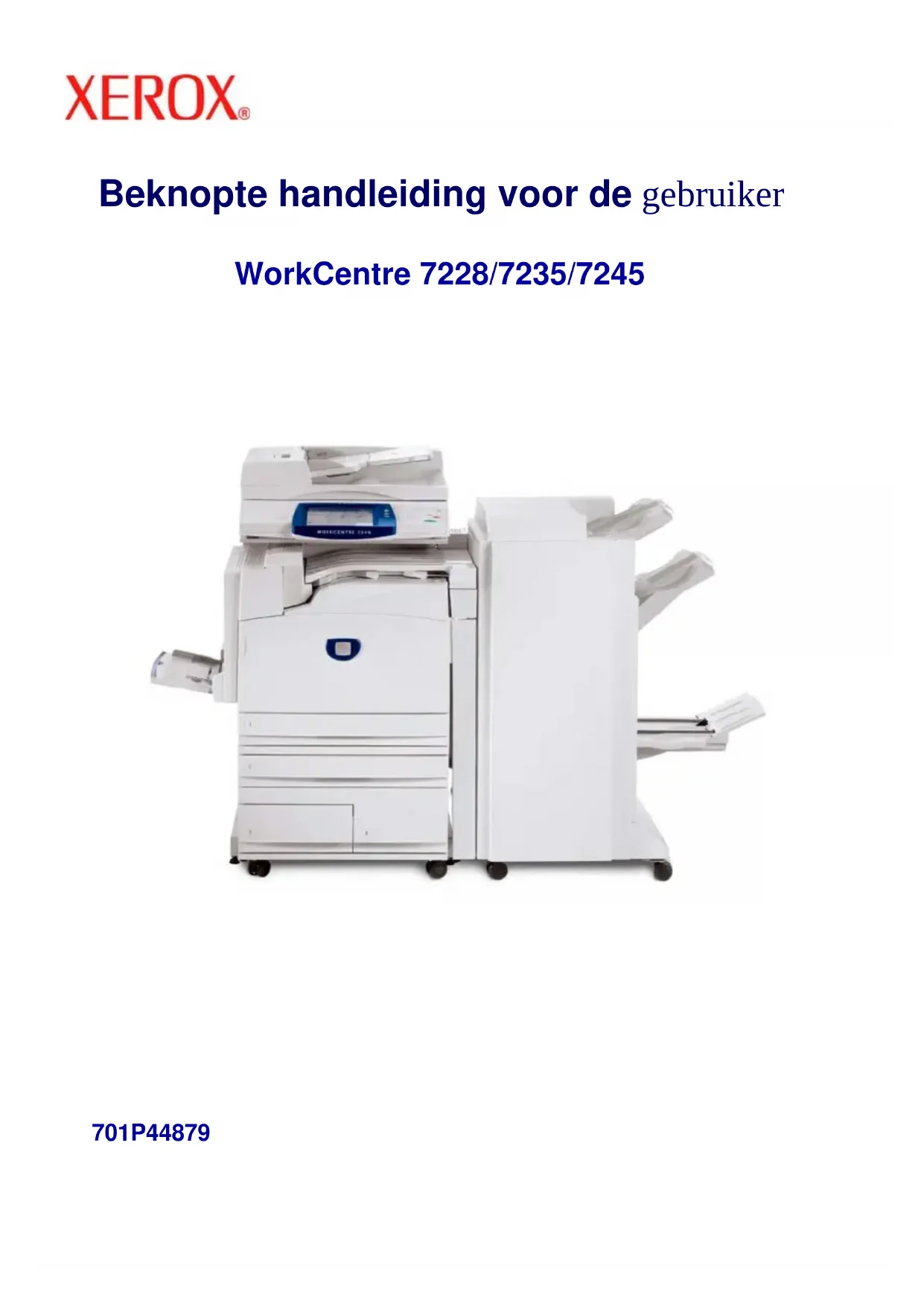 das Modul nicht richtig installiert. Modulsitz und -verriegelung prüfen. Damit sind die Erläuterungen zum Austauschen des Tonermoduls abgeschlossen.Beknopte handleiding voor de gebruiker WorkCentre 7228/7235/7245 701P44879OPMERKING: BLAUWE titels zijn voor IT-beheerders, GROENE voor eindgebruikers RODE betekenen dat er iets aan de hand is met het apparaat. De gebruikersinterface kan variëren, afhankelijk van de configuratie van het apparaat. Microsoft, MS-DOS, Windows, Windows NT, Microsoft Network, en Windows Server zijn handelsmerken of gedeponeerde handelsmerken van Microsoft Corporation in de Verenigde Staten en/of andere landen. Novell, NetWare, IntranetWare en NDS zijn gedeponeerde handelsmerken van Novell, Inc. in de Verenigde Staten en andere landen. Adobe, Acrobat, PostScript, PostScript3, en PostScript Logo zijn handelsmerken van Adobe Systems Incorporated. Apple, AppleTalk, EtherTalk, LocalTalk, Macintosh, MacOS en TrueType zijn handelsmerken van Apple Computer, Inc., gedeponeerd in de VS en andere landen. HP, HPGL, HPGL/2, en HP-UX zijn gedeponeerde handelsmerken van Hewlett- Packard Corporation. Alle product-/merknamen zijn (gedeponeerde) handelsmerken van de respecti eve houders. Gegevens die op de harde schijf zijn opgeslagen, kunnen verloren gaan als gevolg van een fout in de harde schijf. Xerox is niet verantwoordelijk voor directe of indirecte schade voortvloeiende uit of veroorzaakt door een dergelijk gegevensverlies. X erox is niet verantwoordelijk voor het uitvallen van apparaten ten gevolge van een computervirus of hacking. Belangrijk (1) Deze handleiding is auteursrechtelijk beschermd. Alle rechten voorbehouden. Volgens de wet op het auteursrecht mag deze handleiding niet geheel of gedeeltelijk worden gekopieerd of aangepast zonder schriftelijke toestemming van de uitgever. (2) Delen van deze handleiding kunnen zonder voorafgaande kennisgeving worden gewijzigd. (3) Opmerkingen over onduidelijk, foutieve of ontbrekende tekst of pagina's is welkom. (4) Nooit een procedure op het apparaat uitvoeren die niet specifiek in deze handleiding staat vermeld. Ongeoorloofde handelingen kunnen resulteren in defecten of ongelukken. Xerox is niet aansprakelijk voor problemen voortvloeiende uit het ongeoorloofde gebruik van de apparatuur. De export van dit product is strikt beperkt volgens de wetten inzake ruil en handel met het buitenland van Japan en/of de exportregelingen van de Verenigde Staten. Xerox en Ethernet zijn gedeponeerde handelsmerken.WorkCentre 7228/7235/7245 WorkCentre 7228/7235/7245 Beknopte handleiding voor de gebruiker Inhoudsopgave Bedieningspaneel Een configuratie-overzicht afdrukken