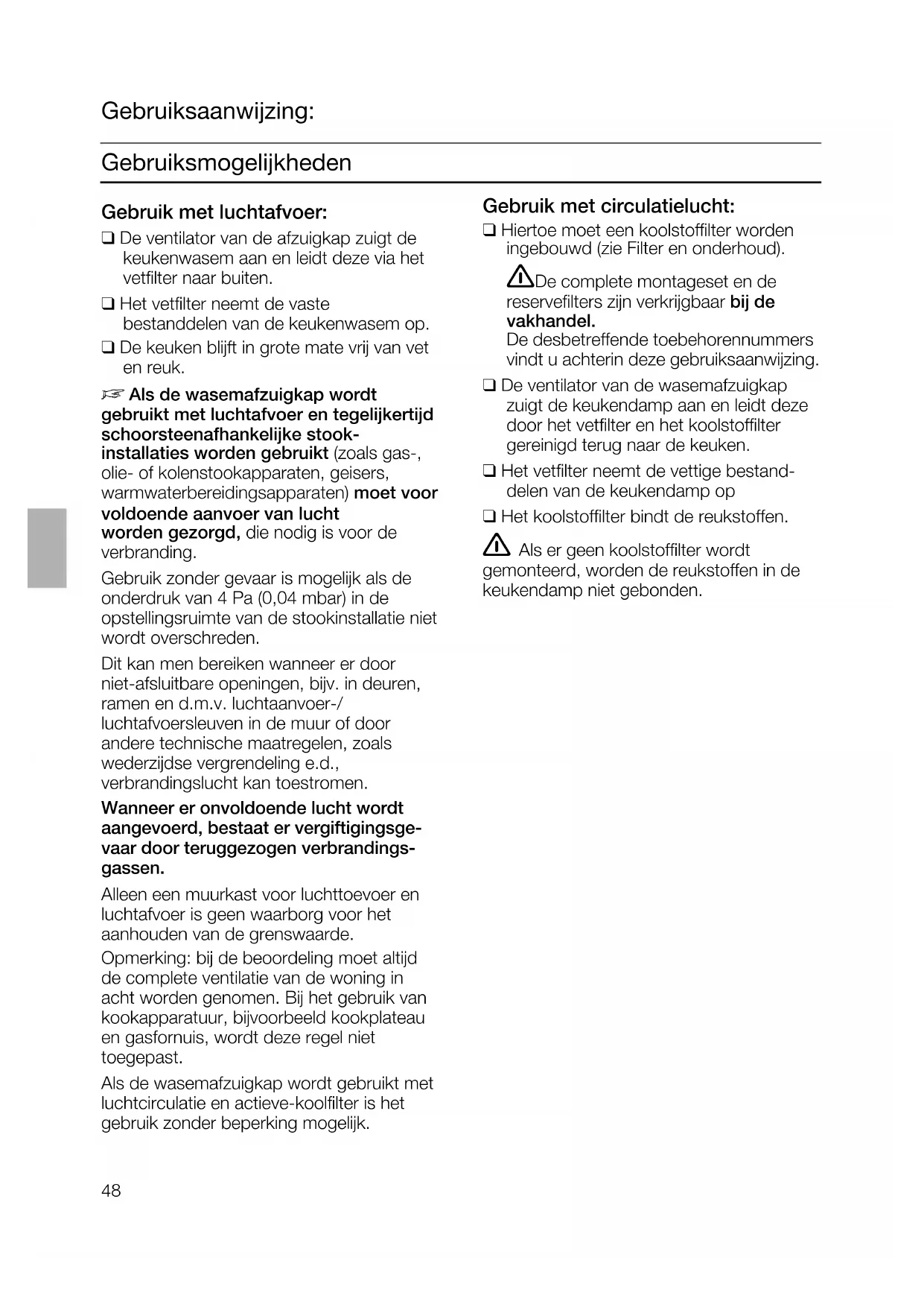 la notice d'utilisation).48 Gebruiksmogelijkheden Gebruik met luchtafvoer: ❑ De ventilator van de afzuigkap zuigt de keukenwasem aan en leidt deze via het vetfilter naar buiten. ❑ Het vetfilter neemt de vaste bestanddelen van de keukenwasem op. ❑ De keuken blijft in grote mate vrij van vet en reuk.