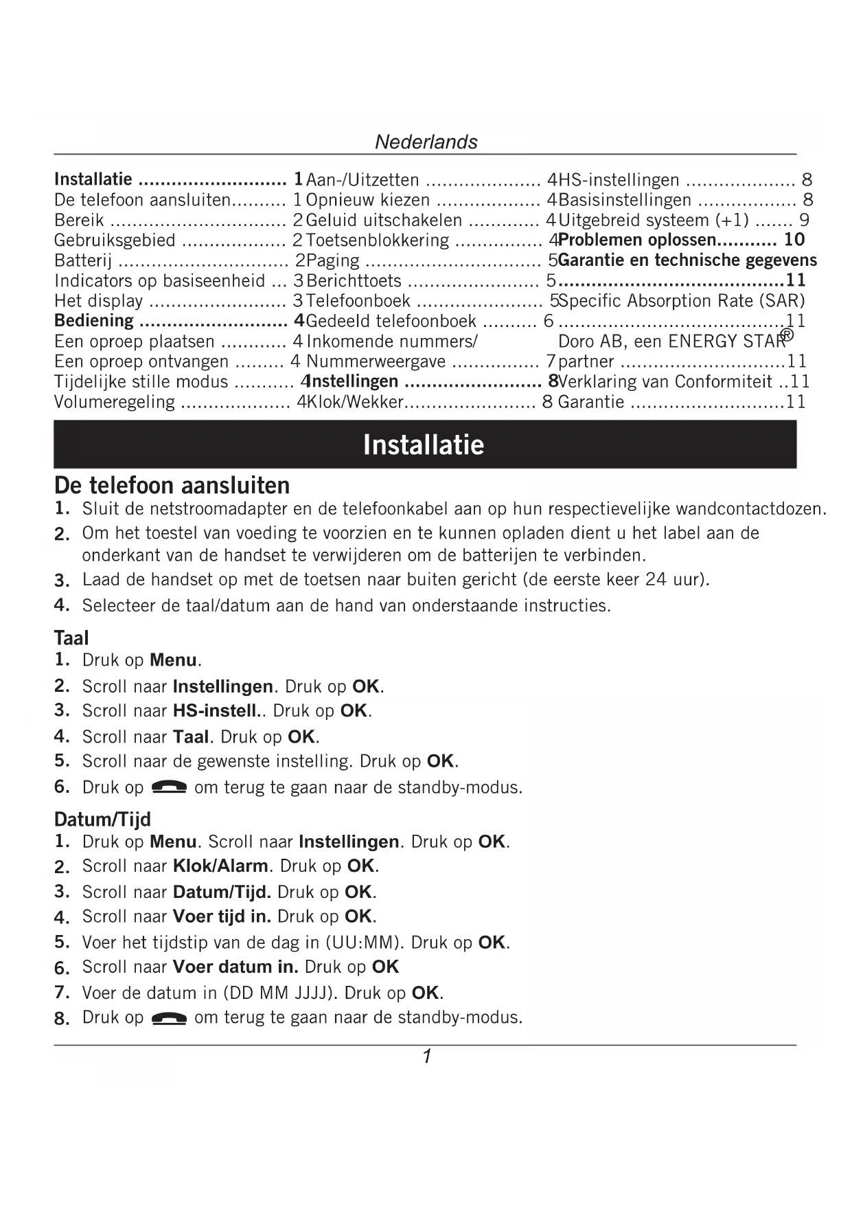 - 12 Nederlands Garantie en technische gegevens Specic Absorption Rate (SAR) Dit apparaat voldoet aan de betreffende internationale veiligheidseisen voor blootstelling aan radiogolven. De waarde voor deze telefoon bedraagt 0.009 W/kg (gemeten op 10g weefsel). De maximale limiet volgens de Wereldgezondheidsorganisatie WHO is 2W/kg (gemeten op 10g weefsel). Doro AB, een ENERGY STAR