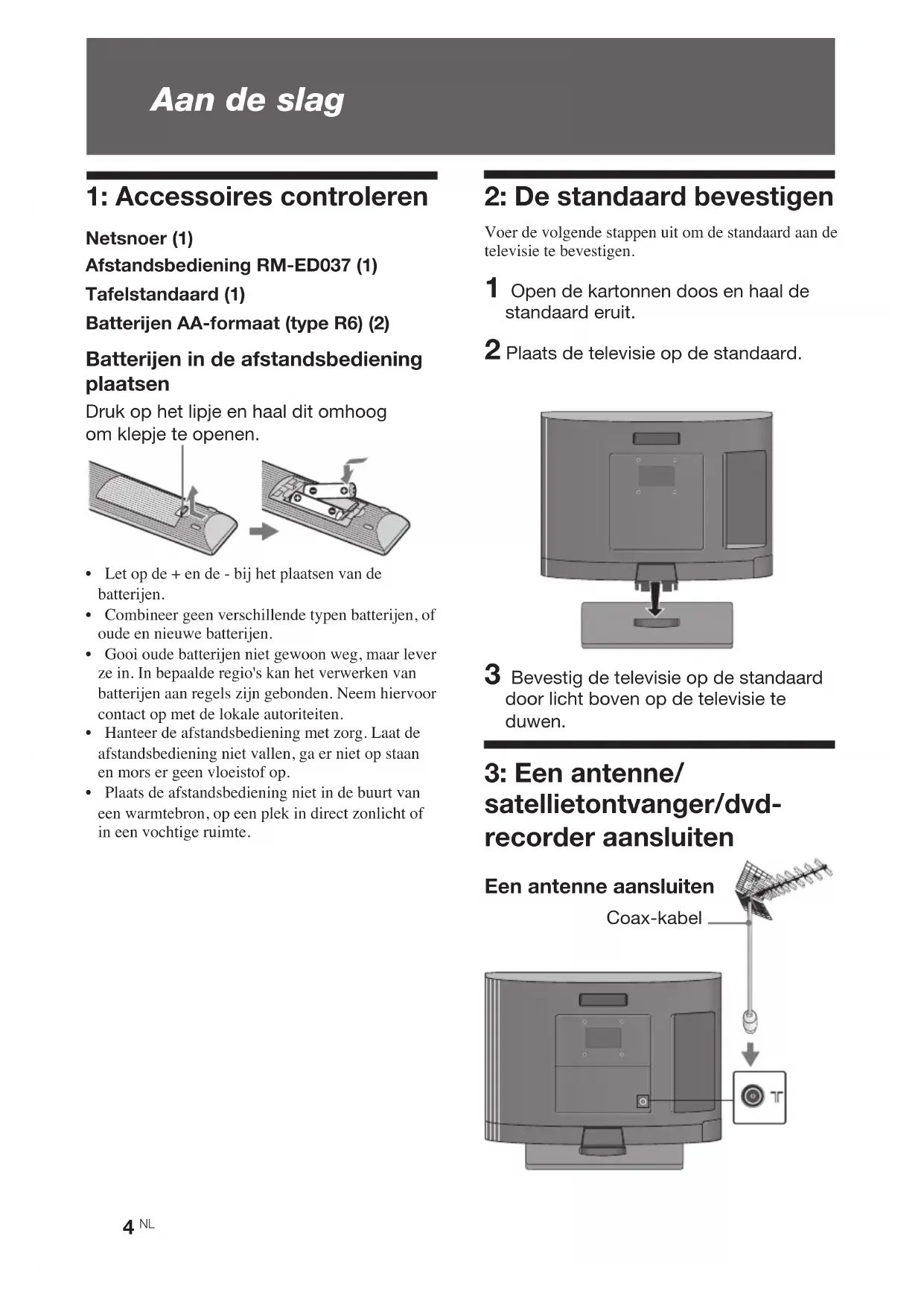 plaatsen • Letopde+ende-bijhetplaatsenvandebatterijen.• Combineergeenverschillendetypenbatterijen,ofoudeennieuwebatterijen.• Gooioudebatterijennietgewoonweg,maarleverzein.Inbepaalderegio'skanhetverwerkenvanbatterijenaanregelszijngebonden.Neemhiervoorcontactopmetdelokaleautoriteiten.• Hanteerdeafstandsbedieningmetzorg.Laatdeafstandsbedieningnietvallen,gaernietopstaanenmorsergeenvloeistofop.• Plaatsdeafstandsbedieningnietindebuurtvaneenwarmtebron,opeenplekindirectzonlichtofineenvochtigeruimte. 2: De standaard bevestigen Voerdevolgendestappenuitomdestandaardaandetelevisietebevestigen. 1 Open de kartonnen doos en haal de
