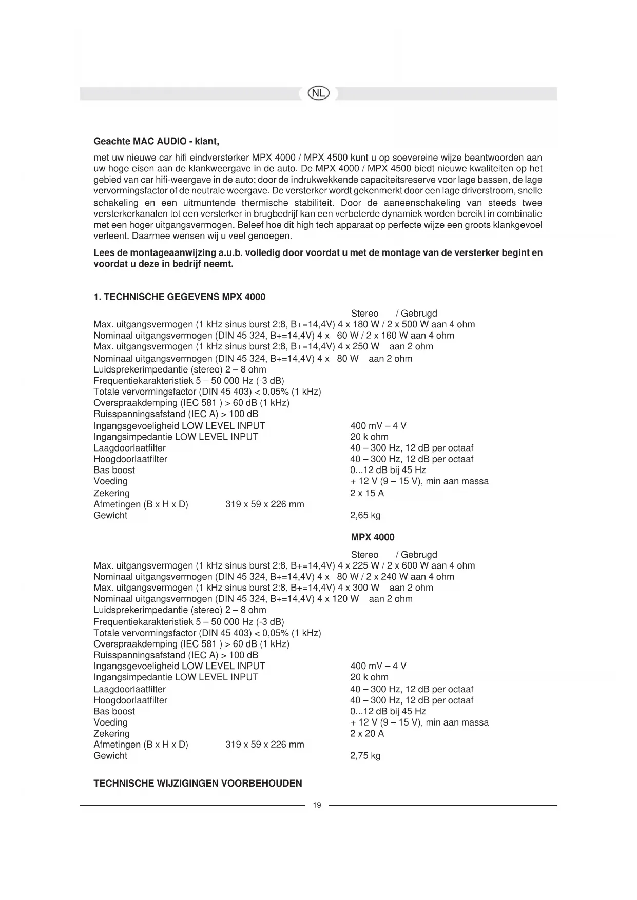 Geachte MAC AUDIO - klant, met uw nieuwe car hifi eindversterker MPX 4000 / MPX 4500 kunt u op soevereine wijze beantwoorden aan uw hoge eisen aan de klankweergave in de auto. De MPX 4000 / MPX 4500 biedt nieuwe kwaliteiten op het gebied van car hifi-weergave in de auto; door de indrukwekkende capaciteitsreserve voor lage bassen, de lage vervormingsfactor of de neutrale weergave. De versterker wordt gekenmerkt door een lage driverstroom, snelle schakeling en een uitmuntende thermische stabiliteit. Door de aaneenschakeling van steeds twee versterkerkanalen tot een versterker in brugbedrijf kan een verbeterde dynamiek worden bereikt in combinatie met een hoger uitgangsvermogen. Beleef hoe dit high tech apparaat op perfecte wijze een groots klankgevoel verleent. Daarmee wensen wij u veel genoegen. Lees de montageaanwijzing a.u.b. volledig door voordat u met de montage van de versterker begint en voordat u deze in bedrijf neemt.