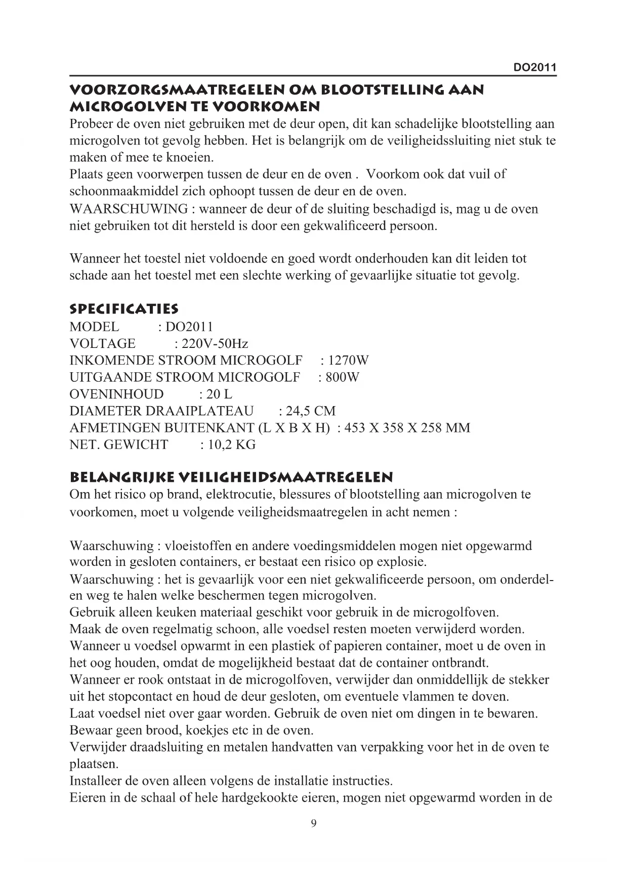 Gebruik het toestel alleen zoals het beschreiben staat in de handleiding. Gebruik geen schadelijke chemicalien of dampen in dit toestel. Deze oven is enkel bedoeld om teverwarmen. Het toestel is Niet geschikt voor industrieel of laboratorium gebruik.