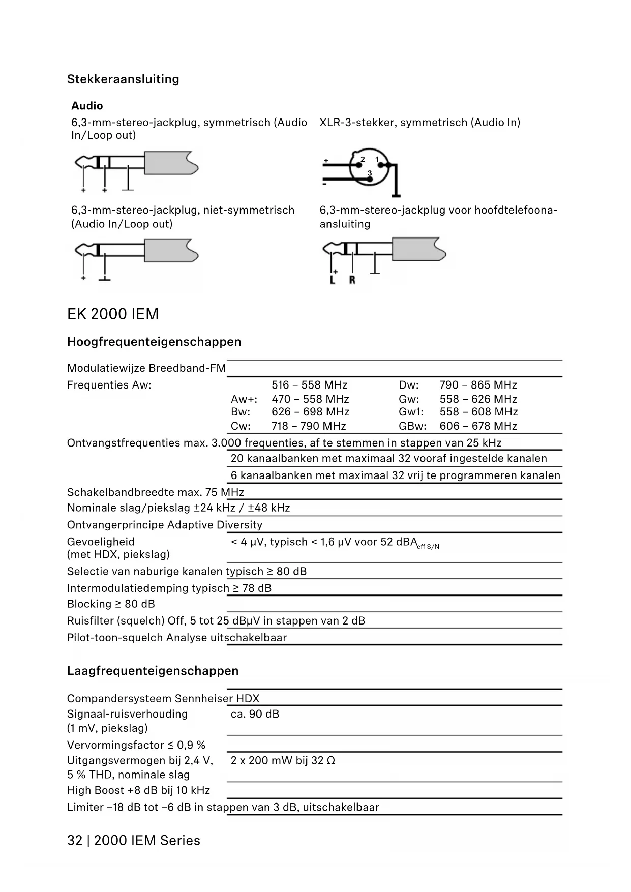 6,3-mm-stereo-jackplug, niet-symmetrisch (Audio In/Loop out) 6,3-mm-stereo-jackplug voor hoofdtelefoona- ansluiting EK 2000 IEM Hoogfrequenteigenschappen Modulatiewijze Breedband-FM Frequenties Aw: Aw+: Bw: Cw: 516 – 558 MHz 470 – 558 MHz 626 – 698 MHz 718 – 790 MHz Dw: Gw: Gw1: GBw: 790 – 865 MHz 558 – 626 MHz 558 – 608 MHz 606 – 678 MHz Ontvangstfrequenties max. 3.000 frequenties, af te stemmen in stappen van 25 kHz 20 kanaalbanken met maximaal 32 vooraf ingestelde kanalen 6 kanaalbanken met maximaal 32 vrij te programmeren kanalen Schakelbandbreedte max. 75 MHz Nominale slag/piekslag ±24 kHz / ±48 kHz Ontvangerprincipe Adaptive Diversity Gevoeligheid (met HDX, piekslag) < 4 μV, typisch < 1,6 μV voor 52 dBA eff S/N Selectie van naburige kanalen typisch ≥ 80 dB Intermodulatiedemping typisch ≥ 78 dB Blocking ≥ 80 dB Ruisfilter (squelch) Off, 5 tot 25 dBμV in stappen van 2 dB Pilot-toon-squelch Analyse uitschakelbaar Laagfrequenteigenschappen Compandersysteem Sennheiser HDX Signaal-ruisverhouding (1 mV, piekslag) ca. 90 dB Vervormingsfactor ≤ 0,9 % Uitgangsvermogen bij 2,4 V, 5 % THD, nominale slag 2 x 200 mW bij 32 Ω High Boost +8 dB bij 10 kHz Limiter –18 dB tot –6 dB in stappen van 3 dB, uitschakelbaar2000 IEM Series | 33