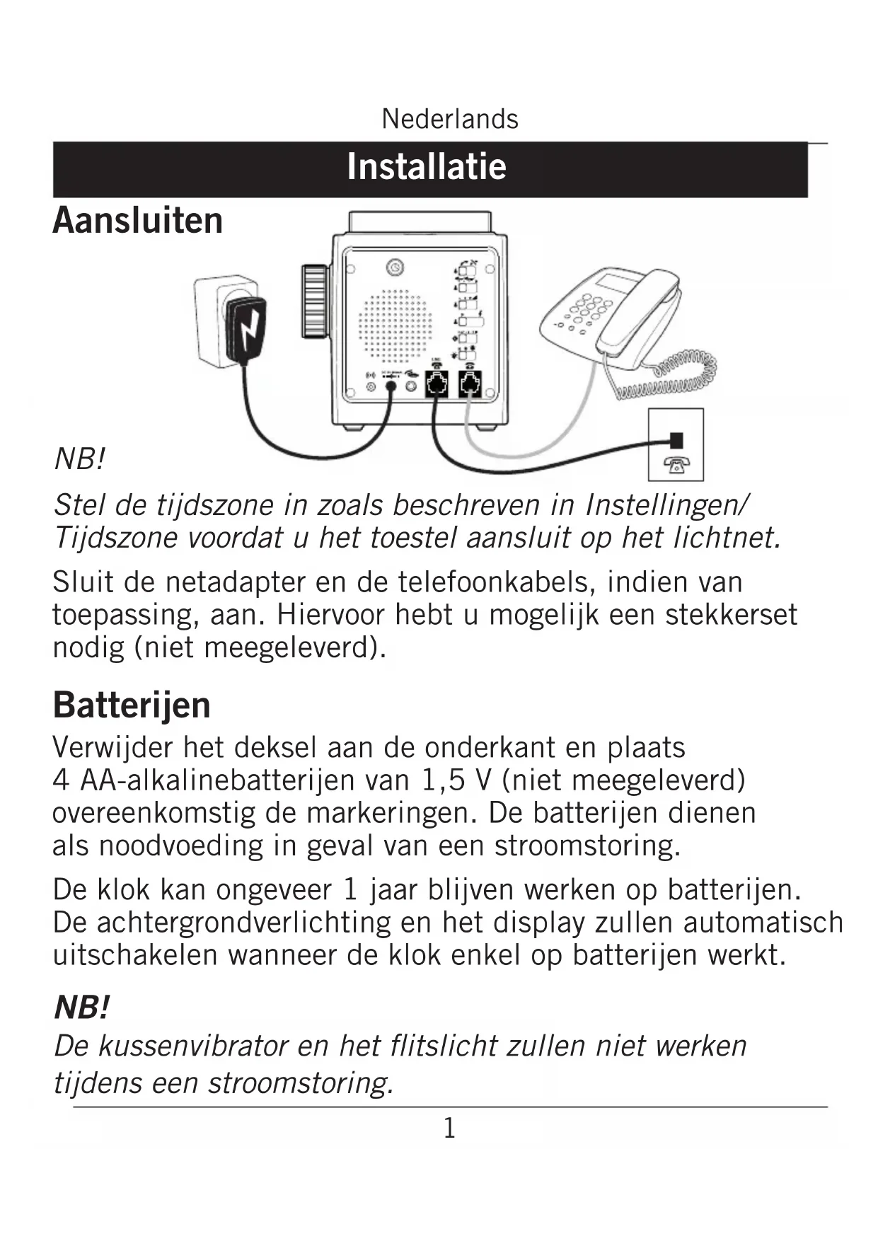 Alarmtoon Tijdzone Helderheid Telefoonaansluiting Lijnaansluiting Aansluiting kussenvibrator Aansluiting netadapter Aansluiting extern alarm Luidspreker