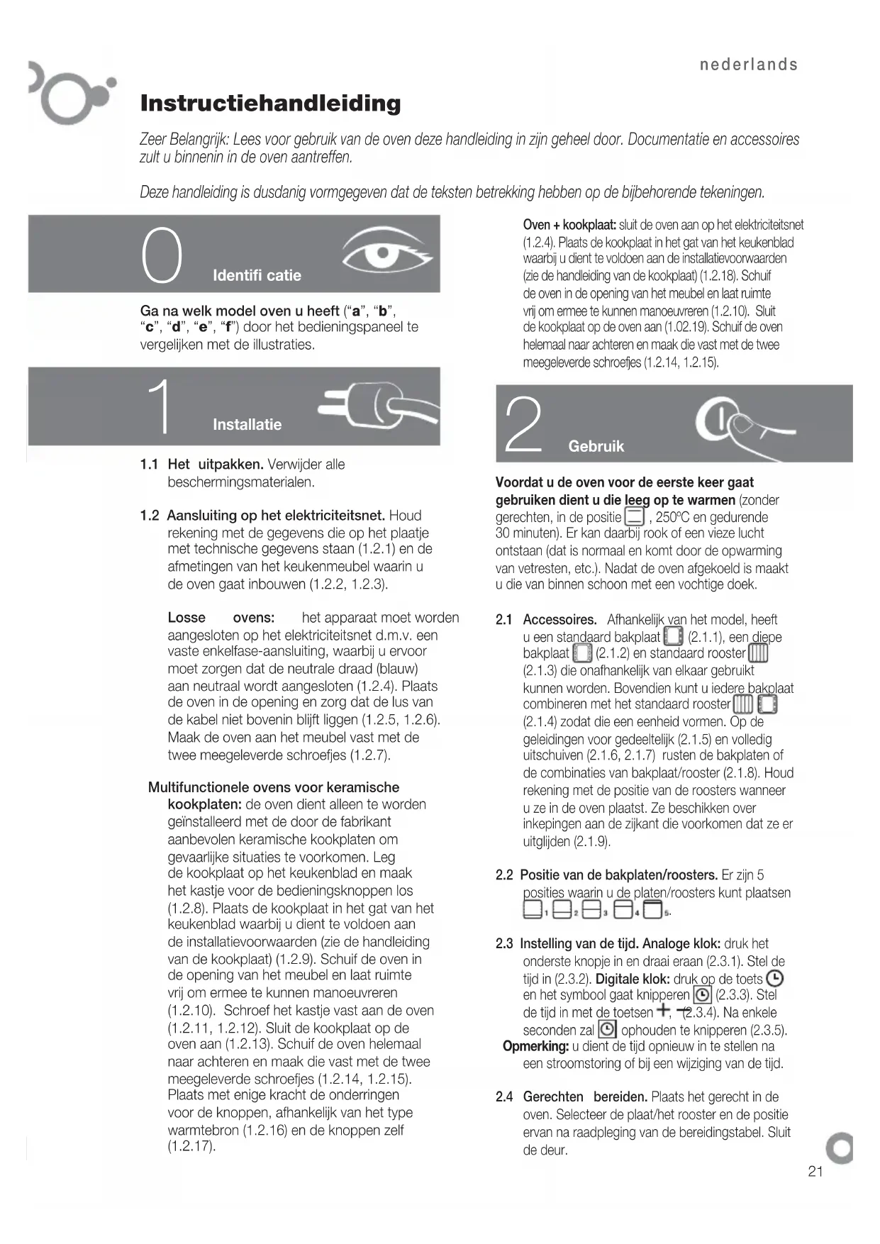 Instructiehandleiding Zeer Belangrijk: Lees voor gebruik van de oven deze handleiding in zijn geheel door. Documentatie en accessoires zult u binnenin in de oven aantreffen. Deze handleiding is dusdanig vormgegeven dat de teksten betrekking hebben op de bijbehorende tekeningen.