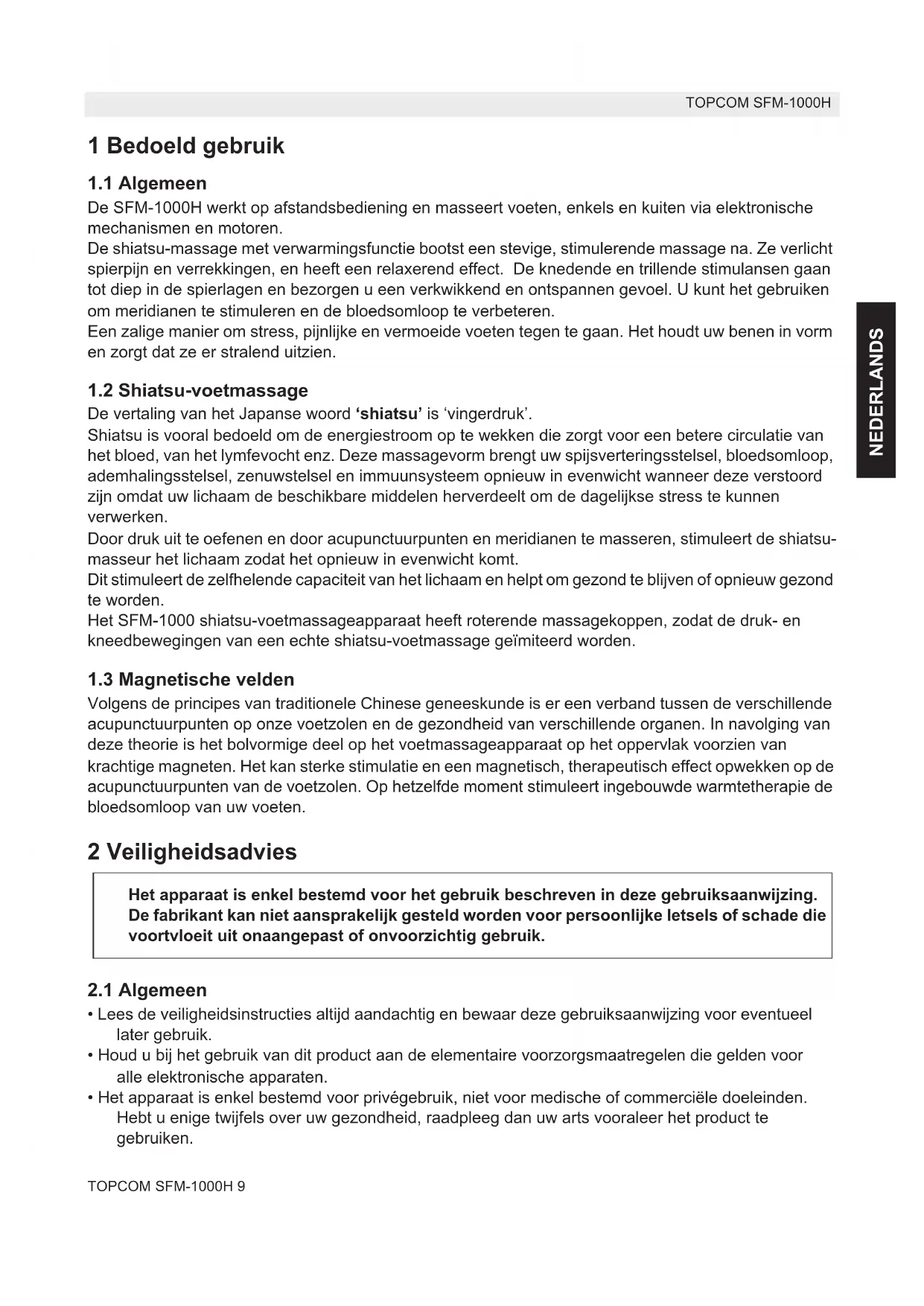 - Het apparaat is enkel bestemd voor privégebruik, niet voor medische of commerciële doeleinden. Hebt u enige twijfels over uw gezondheid, raadpleeg dan uw arts vooraleer het product te gebruiken. Het apparaat is enkel bestemd voor het gebruik beschreven in deze gebruiksaanwijzing. De fabrikant kan niet aansprakelijk gesteld worden voor persoonlijke letsels of schade die voortvloeit uit onaangepast of onvoorzichtig gebruik.10 TOPCOM SFM-1000H