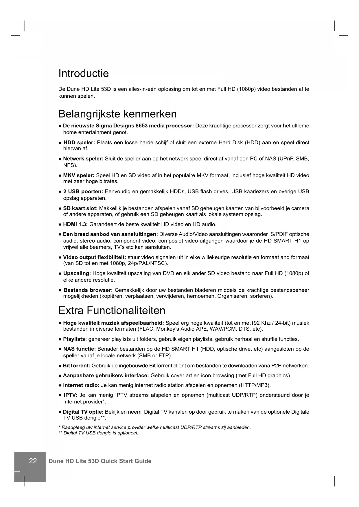 Toegang tot netwerk schijven Voor het aansluiten van een netwerk schijf met behulp van SMB of NFS-protocol, dient u ervoor te zorgen dat u op het beginscherm van de speler staat, en drukt op de «MENU» knop van de afstandsbediening, kies «Maak netwerk Folder», voor de details van de netwerkschijf in indien nodig. Om te bladeren in de lijst van de netwerk toegankelijke bestanden via SMB of UPnP, gebruik je het «Network Browser» item in het beginscherm van de speler. OPMERKING: Als sommige netwerkbronnen worden niet weergegeven door de speler, moet u enkele minuten wachten en dan opnieuw proberen (of druk op de «MENU» knop van de afstandsbediening en kies «Refresh»). Formatteren harde schijf Om een harde schijf te formatteren, selecteer het station, druk op de «INFO» knop van de afstandsbediening en kies «Format Disk» (de gehele schijf) of «Format Partition» (alleen een bepaalde partitie). De speler zal de schijf formatteren in «EXT2» bestandssysteem. OPMERKING: Voor het gebruik van schijven welke zijn geformatteerd door de speler en u de schijf los aansluit op een Windows-pc, moet u mogelijk extra software installeren op de PC, zoals «EXT2FSD» (http:// www.ext2fsd.com/).27 Nederlands De speler aan en uit zetten Om de speler in de standby-modus, drukt u op de «POWER» knop van de afstandsbediening of de «on / off»-knop op het voorpaneel. Als u de standby-modus, drukt u nogmaals op een van deze knoppen. Afhankelijk van de instellingen van de speler zal de «hardware standby» of «soft-standby»-modus worden gebruikt. In de «hardware standby» modus, zal de speler bijna compleetpower-uitgaan en gebruikt nagenoeg geen stroom. In de «software standby» modus zal de speler alleen geen signaal op de video- uitgang geven, maar functioneert deze nog steeds. Bijvoorbeeld, als u een aantal opslagapparaten aangesloten heeft op de speler kunt u nog steeds toegang verkrijgen («NAS» functie van de speler). Het verlaten van de «software standby» modus duurt slechts enkele seconden. Wanneer de speler zich in de «software standby» modus bevind, verbruikt hij nog steeds aanzienlijk stroom. Het is niet aan te raden om de speler voor lange tijd in de «software standby» modus te gebruiken, zeker als dit niet nodig is. OPMERKING: Na het uitschakelen van de speler is het aanbevolen om ongeveer 1 minuut te wachten alvorens deze weer aan te zetten. NAS (Network Attached Storage) U krijgt toegang tot de opslag-apparaten aangesloten op de speler via het lokale netwerk middels gebruik te maken van FTP en SMB-protocollen. Op een Windows PC, typ je gewoon «ftp://ip_address» of «\ \ ip_adres» in de Windows verkenner, waar «ip_adres» is het IP-adres van de speler. WiFi U kunt gebruik maken van een USB WiFi adapter door deze op een vrije USB poort aan te sluiten op de speler. Kijk hier voor de informatie over ondersteunde USB WiFi adapters: http://dune-hd.com/support/hw_compat/ Limitaties Verenigbaarheid/interactie van de speler met een bepaalde hardware (A / V-apparatuur, Netwerkapparatuur, diskdrives, enz) kan afhangen van verschillende factoren (met name hardware model, specifi eke kenmerken van de hardware-installatie en het gebruik, de confi guratie van de speler en de hardware, etc). Als de speler niet correct werkt met bepaald hardware, probeer dan om de confi guratie van de speler of hardware aan te passen, proberen om de hardware te gebruiken op een andere manier, of om een andere hardware te gebruiken proberen. Verenigbaarheid/interactie van de speler met bepaalde media-inhoud (bestanden, schijven, enz.) kan afhangen van verschillende factoren (specifi eke kenmerken van media- inhoud codering, specifi eke kenmerken van de confi guratie van de speler, etc). Als de speler niet goed speelt een bepaalde media-inhoud, probeer dan om de confi guratie van de speler, of probeer media te gebruiken welke gecodeerd is op een andere manier. Updaten van uw speler en het vinden van meer informative Controleer regelmatig op bijgewerkte versies van de fi rmware http://dune-hd.com/fi rmware/ (Opmerking: U kunt de speler ook middels de online fi rmware upgrade functie van de speler updaten, zie Setup / misc / Firmware upgrade.) Kijk hier voor de up to date informatie aangaande handleidingen en support: http://dune-hd.com/manuals/ http://dune-hd.com/support/28 Dune HD Lite 53D Quick Start Guide Introducción Dune HD Lite 53D es la solución todo en uno, con una reproducción de video Full HD (1080p). Características principales ● El nuevo procesador Sigma Designs 8653: disfrute de la reproducción y un excelente rendimiento de las características interactivas. ● Reproducción desde el disco duro: conecte un disco duro al reproductor y reproduzca el contenido desde el disco duro. ● Reproducción en red: conecte el reproductor a una red local y reproduzca directamente desde el PC o NAS (UPnP, SMB, NFS). ● Reproduce MKV: reproduce vídeo HD y SD en el popular formato MKV y otros formatos de vídeo mo- dernos, incluida la alta calidad de vídeo HD con bitrate muy alto. ● 2 puertos USB: conecte discos duros, unidades flash USB, lectores de tarjetas USB y otros dispositivos de almacenamiento USB. ● Ranura para tarjetas SD: reproduzca fácilmente archivos multimedia desde la tarjeta de memoria SD de tu cámara u otros dispositivos, o utilice una tarjeta de memoria SD como almacenamiento local o de sistema (necesaria para la función BD Live). ● HDMI 1.3: garantizar la máxima calidad de vídeo HD y audio HD. ● Un amplio conjunto de conectores A / V: Use S/PDIF óptico, audio estéreo, video componente, sali- das de vídeo compuesto para conectar fácilmente a cualquier equipo de A / V. ● Flexibilidad de salidas da Video: salida de vídeo en cualquier resolución y formato (de SD a 1080p, 24p/PAL/NTSC). ● Mejora de la resolución: escalado de alta calidad de DVD y cualquier otro contenido de vídeo SD en Full HD (1080p) o de otro tipo de resolución de alta definición. ● Expl