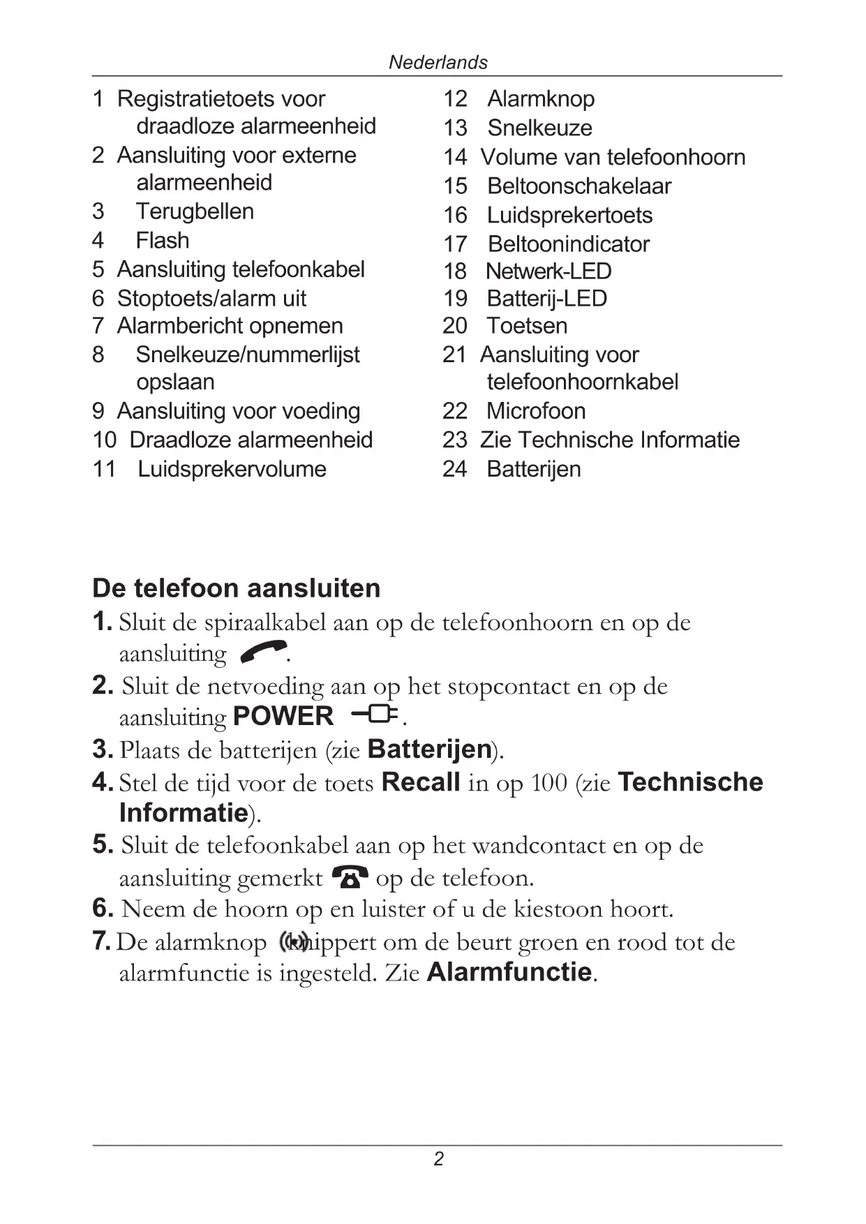 Nederlands 1 Registratietoets voor draadloze alarmeenheid 2 Aansluiting voor externe alarmeenheid 3 Terugbellen 4 Flash 5 Aansluiting telefoonkabel 6 Stoptoets/alarm uit 7 Alarmbericht opnemen 8 Snelkeuze/nummerlijst opslaan 9 Aansluiting voor voeding 10 Draadloze alarmeenheid 11 Luidsprekervolume 12 Alarmknop 13 Snelkeuze 14 Volume van telefoonhoorn 15 Beltoonschakelaar 16 Luidsprekertoets 17 Beltoonindicator 18 Netwerk-LED 19 Batterij-LED 20 Toetsen 21 Aansluiting voor telefoonhoornkabel 22 Microfoon 23 Zie Technische Informatie 24 Batterijen De telefoon aansluiten 1.Sluitdespiraalkabelaanopdetelefoonhoornenopde aansluiting