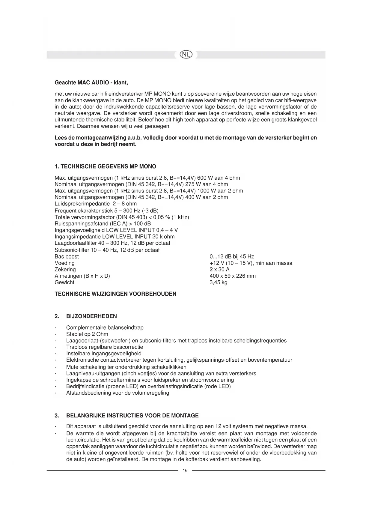 Geachte MAC AUDIO - klant, met uw nieuwe car hifi eindversterker MP MONO kunt u op soevereine wijze beantwoorden aan uw hoge eisen aan de klankweergave in de auto. De MP MONO biedt nieuwe kwaliteiten op het gebied van car hifi-weergave in de auto; door de indrukwekkende capaciteitsreserve voor lage bassen, de lage vervormingsfactor of de neutrale weergave. De versterker wordt gekenmerkt door een lage driverstroom, snelle schakeling en een uitmuntende thermische stabiliteit. Beleef hoe dit high tech apparaat op perfecte wijze een groots klankgevoel verleent. Daarmee wensen wij u veel genoegen. Lees de montageaanwijzing a.u.b. volledig door voordat u met de montage van de versterker begint en voordat u deze in bedrijf neemt.