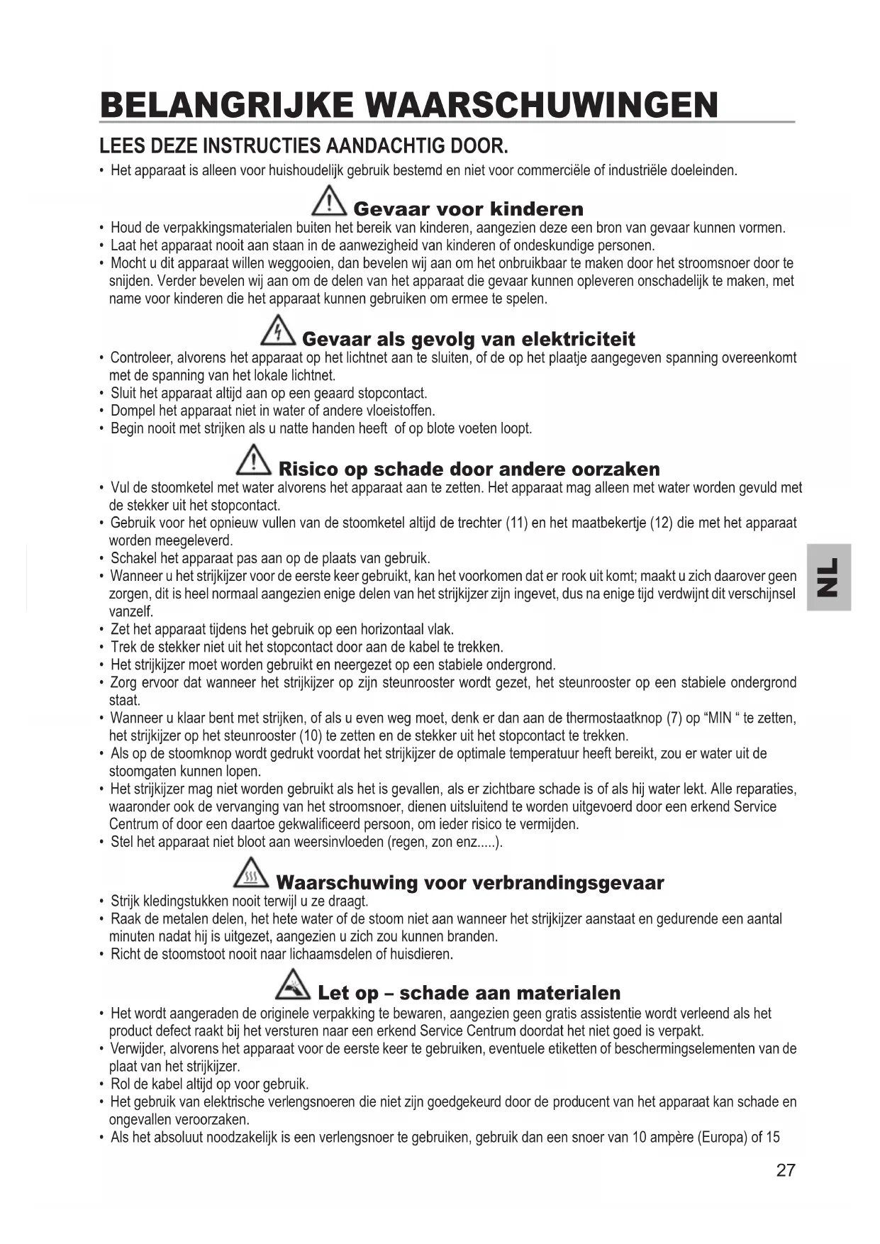 NL BELANGRIJKE WAARSCHUWINGEN Lees deze instructies aandachtig door. • Het apparaat is alleen voor huishoudelijk gebruik bestemd en niet voor commerciële of industriële doeleinden.