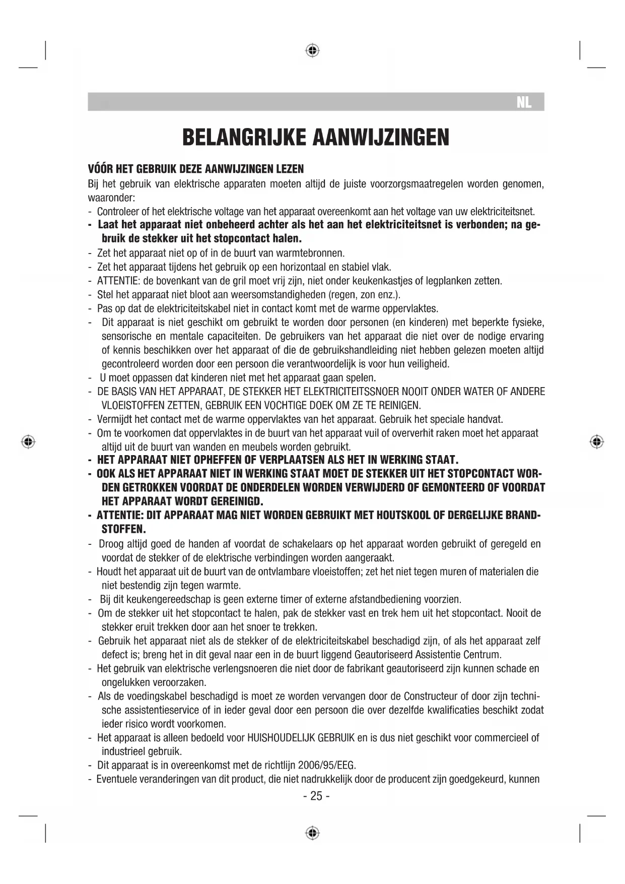 - 24 -BELANGRIJKE AANWIJZINGEN VÓÓR HET GEBRUIK DEZE AANWIJZINGEN LEZEN Bij het gebruik van elektrische apparaten moeten altijd de juiste voorzorgsmaatregelen worden genomen,