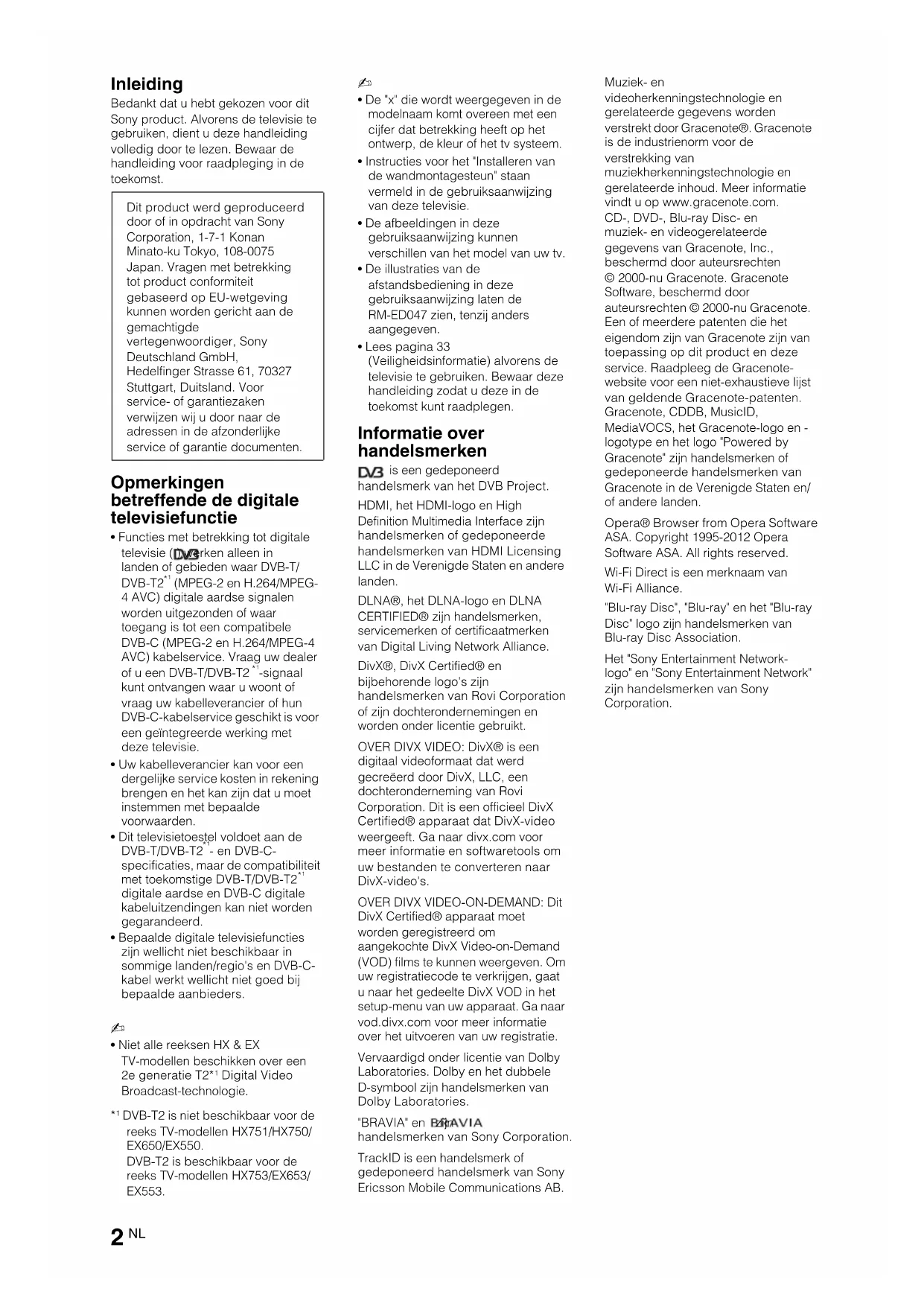 Televisie kijken • Sommige mensen kunnen ongemakken ervaren (vermoeide ogen, vermoeidheid of misselijkheid) bij het bekijken van 3D-beelden of het spelen van stereoscopische 3D-games. Sony raadt alle gebruikers aan regelmatig rustpauzes in te lassen bij het bekijken van 3D-beelden of het spelen van stereoscopische 3D-games. De lengte en de frequentie van de nodige rustpauzes variëren van persoon tot persoon. U moet zelf beslissen wat voor u het best is. Als u ongemakken ervaart, dient u het bekijken van 3D-beelden of het spelen van stereoscopische 3D-games stop te zetten tot het ongemak over is. Raadpleeg indien nodig een dokter. Raadpleeg eveneens (i) de gebruiksaanwijzing van alle andere apparaten of media die u gebruikt in combinatie met deze tv en (ii) onze website (http://www.sony-europe.com/myproduct) voor de recentste informatie. De ogen van jonge kinderen (vooral jonger dan zes jaar) zijn nog steeds in ontwikkeling. Raadpleeg een arts (bv. een kinderarts of oogarts) voor u jonge kinderen 3D-beelden laat bekijken of stereoscopische 3D-games laat spelen. Volwassen dienen ervoor te zorgen dat jonge kinderen de bovenstaande aanbevelingen opvolgen.• Gebruik of bewaar de 3D Bril of de batterij niet in de buurt van vuur of op plaatsen met een hoge temperatuur, bv. in direct zonlicht of in een auto die in de zon staat.• Wanneer u de gesimuleerde 3D-functie gebruikt, dient u er rekening mee te houden dat het weergegeven beeld niet helemaal gelijk is aan het oorspronkelijke beeld ten gevolge van de conversie die door de televisie wordt uitgevoerd.• Kijk televisie met gedempt licht, omdat televisie kijken in het donker of gedurende een lange periode de ogen extra belast.• Als u een hoofdtelefoon gebruikt, mag u het volume niet te hoog zetten om gehoorbeschadiging te voorkomen. LCD-scherm • Hoewel het LCD-scherm is vervaardigd met precisietechnologie en 99,99% of meer van de pixels werken, kunnen er toch donkere of heldere puntjes (rood, blauw of groen) permanent zichtbaar zijn op het LCD-scherm. Dit is een structureel kenmerk van een LCD-scherm en duidt niet op een defect.• Druk en kras niet op het scherm en plaats geen voorwerpen op het televisietoestel. Het beeld kan hierdoor vervormen of het LCD-scherm kan beschadigen.• Als het televisietoestel op een koude plaats wordt gebruikt, kan het beeld vlekkerig of donker zijn. Dit wijst niet op een storing. Dit verschijnsel verdwijnt wanneer de temperatuur stijgt.• Bij langdurige weergave van stilstaande beelden kunnen spookbeelden optreden. Deze kunnen na enige tijd verdwijnen.• Het scherm en de kast worden warm als het televisietoestel wordt gebruikt. Dit duidt niet op een defect.• Het LCD-scherm bevat een kleine hoeveelheid vloeibare kristallen en kwik. Gooi het toestel weg volgens de geldende lokale wetgeving en voorschriften. Schermoppervlak/kast