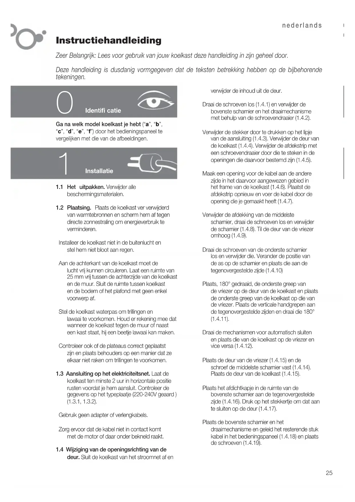 1.3 Aansluiting op het elektriciteitsnet. Laat de koelkast ten minste 2aar in horizontale positie rusten voordat je hem aansluit. Controller de gegevens op het typeplaatje (220-240V geaard) (1.3.1, 1.3.2).