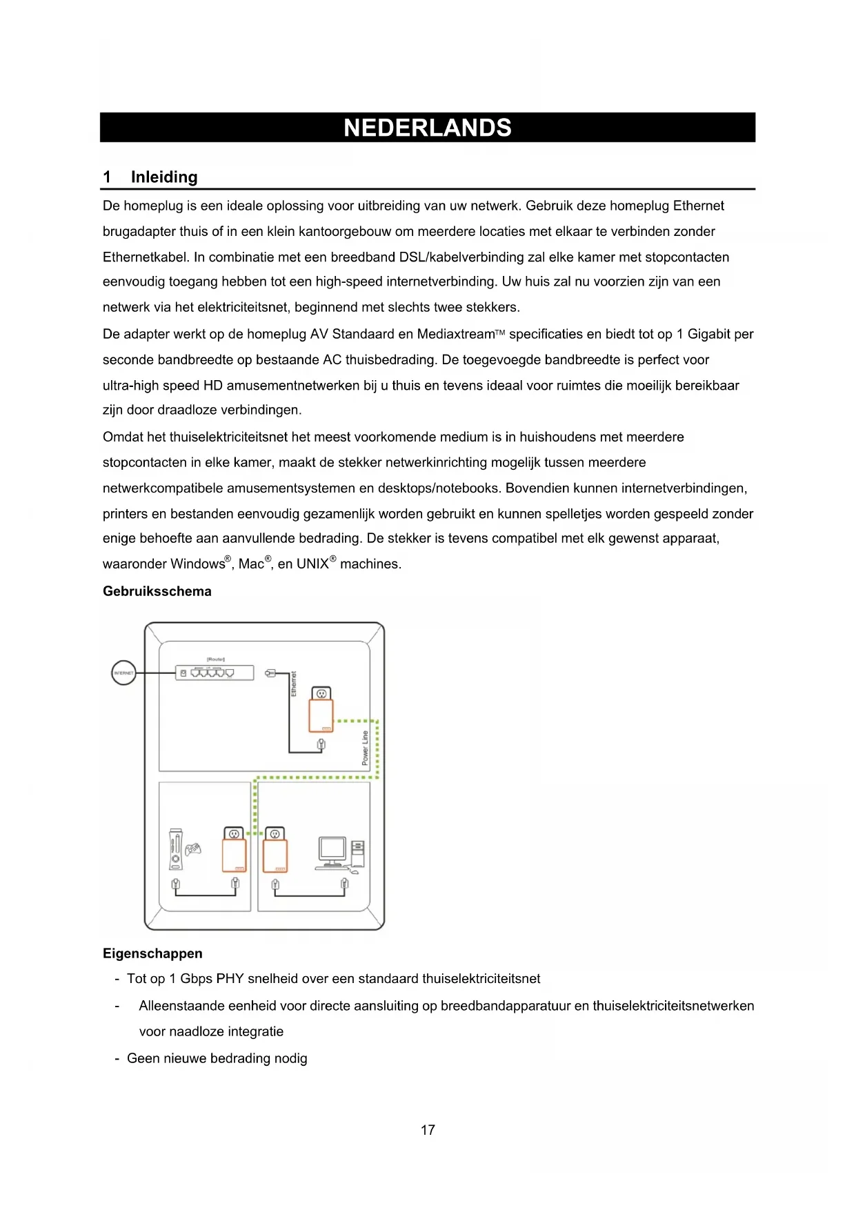 specificaties en biedt tot op 1 Gigabit per seconde bandbreedte op bestaande AC thuisbedrading. De toegevoegde bandbreedte is perfect voor ultra-high speed HD amusementnetwerken bij u thuis en tevens ideaal voor ruimtes die moeilijk bereikbaar zijn door draadloze verbindingen. Omdat het thuiselektriciteitsnet het meest voorkomende medium is in huishoudens met meerdere stopcontacten in elke kamer, maakt de stekker netwerkinrichting mogelijk tussen meerdere netwerkcompatibele amusementsystemen en desktops/notebooks. Bovendien kunnen internetverbindingen, printers en bestanden eenvoudig gezamenlijk worden gebruikt en kunnen spelletjes worden gespeeld zonder enige behoefte aan aanvullende bedrading. De stekker is tevens compatibel met elk gewenst apparaat, waaronder Windows