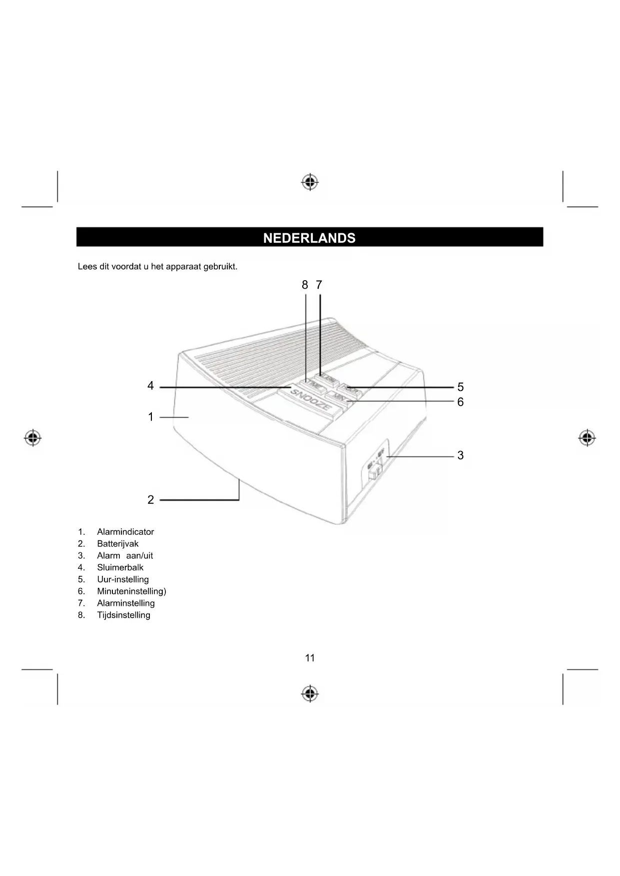 Bediening Steek de stekker van het netsnoer in een 230 V stopcontact. Het gehele scherm zal gaan knipperen, wat betekent dat de verkeerde tijd wordt weergegeven. Dit is een normale conditie en zal stoppen wanneer u de tijd instelt. De tijd instellen Om de tijd in te stellen, druk op de “TIME”-toets (8) en druk vervolgens gelijktijdig op de “MINUTE”-toets (5) en de HOUR-toets (6). Laat de knoppen los om te bevestigen dat de tijd is ingesteld. De wekker instellen Om het alarm in te stellen, druk op de “ALARM”-toets (7) en druk vervolgens gelijktijdig op de “MINUTE”-toets (5) en de “HOUR”-toets (6). Laat de knoppen los om te bevestigen dat het alarm is ingesteld. Bediening van het alarm Schuif de “ALARM ON/OFF”-knop (3) naar de “ON”-positie (aan). De alarmindicator (1) zal oplichten en het alarm zal afgaan op de ingestelde wektijd. Schuif de “ALARM ON/OFF”-knop (3) naar de “OFF”-positie om het alarm uit te schakelen. Snooze (Sluimeren) Als het alarm afgaat, raakt u eenvoudig de SNOOZE-balk (4) aan om tijdelijk het alarm uit te zetten. Na 9 minuten zal de wekker weer afgaan. Dit kan zo vaak u wilt worden herhaald, tot maximaal twee uur. Back-up-batterij (batterij niet inbegrepen) In het geval van een stroomstoring, zal dit toestel automatisch overschakelen naar batterij. Open het batterijvak aan de onderkant van het apparaat en plaats een 9 volt batterij. Tijdens het werken op de batterij, zal de klok de tijd laten doorlopen en het alarm zal afgaan op de ingestelde tijd. Het klokscherm zal niet oplichten om de batterij te sparen. Bij een lange stroomstoring zult u de tijd van de klok een beetje moeten aanpassen nadat de netspanning terugkeert. De klok maakt gebruik van een klokschakeling gevoed door een interne batterij, die minder nauwkeurig is dan het lichtnetfrequentie. De alarmtijd zal correct blijven. Specificaties Voedingsbron: 230 V, 50 Hz DC batterij: 9 V (1 x 9V 6F22 / 6LR61 niet inbegrepen) Energieverbruik: 2 W13 Veiligheidsvoorzorgsmaatregelen: Om het risico op elektrische schokken te voorkomen mag dit product ALLEEN worden geopend door een erkende technicus wanneer er onderhoud nodig is. Koppel het product los van de elektrische voeding en van andere apparatuur als zich problemen voordoen. Stel het product niet bloot aan water of vocht. Onderhoud: Uitsluitend reinigen met een droge doek. Gebruik geen reinigingsmiddelen of schuurmiddelen. Garantie: Voor wijzigingen en veranderingen aan het product of schade veroorzaakt door een verkeerd gebruik van dit product, kan geen aansprakelijkheid worden geaccepteerd. Tevens vervalt daardoor de garantie. Algemeen: Wijziging van ontwerp en specificaties zonder voorafgaande mededeling onder voorbehoud. Alle logo’s, merken en productnamen zijn handelsmerken of geregistreerde handelsmerken van de respectievelijke eigenaren en worden hierbij als zodanig erkend. Bewaar deze gebruiksaanwijzing voor latere raadpleging. Let op: Dit product is voorzien van dit symbool. Dit symbool geeft aan dat afgedankte elektrische en elektronische producten niet met het gewone huisafval verwijderd mogen worden. Voor dit soort producten zijn er speciale inzamelingspunten.14 ITALIANO Sveglia con LED rosso Vi preghiamo di leggere queste istruzioni prima di utilizzare l'unità.