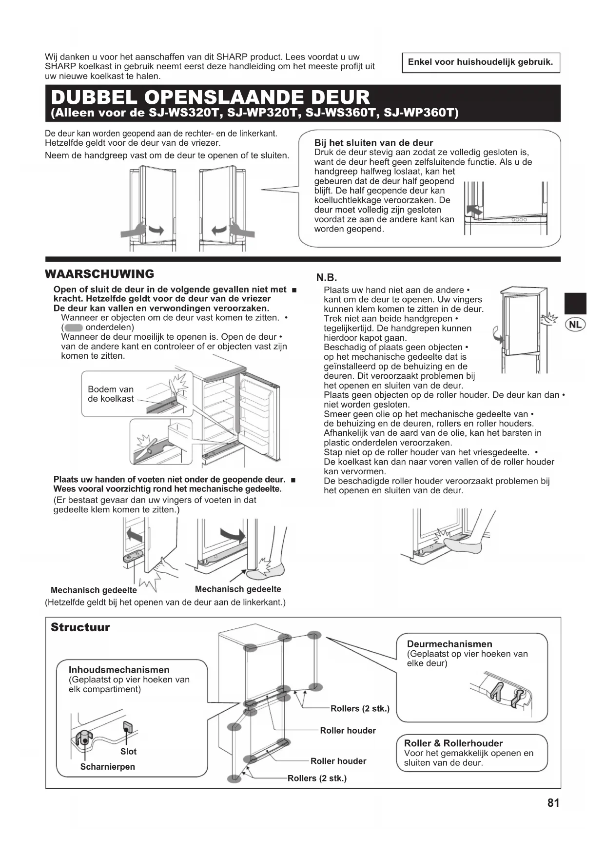 ONDERHOUD EN SCHOONMAKEN ALVORENS VOOR REPARATIE TE BELLEN WAARSCHUWING Trek de stekker van de koelkast uit het stopcontact ■om een elektrische schok te voorkomen.Spat geen water water rechtstreeks op de buitenkant ■of het interieur. Dit kan tot roestvorming en aantasting van de elektrische isolatie leiden. BELANGRIJK Volg deze tips om barsten in de interne bekleding en plastic onderdelen te voorkomen.Veeg olie- of vetresten van voedsel van de plastic • onderdelen.Sommige huishoudelijke schoonmaakmiddelen kunnen • schade veroorzaken. Gebruik dus alleen een sopje met afwasmiddel (zeepwater).Als een onverdund reinigingsmiddel wordt gebruikt of als • het zeepwater niet grondig wordt weggeveegd, kunnen er barsten in het plastic komen. 1 Haal de accessoires zoals koelkastplanken uit de kast en de deur. Maak ze schoon met warm sopje van afwasmiddel, spoel ze af en maak ze droog. 2 Maak de binnenkant schoon met een doek gedrenkt in een warm sopje van afwasmiddel. Gebruik vervolgens koud water om het zeepwater weg te vegen. 3 Maak de buitenkant schoon met een zachte doek als hij vuil is. 4 Maak de magnetische deursluiting schoon met een tandenborstel en een warm sopje van afwasmiddel. 5 Veeg het bedieningspaneel met een droge doek af. N.B. Om schade aan uw koelkast te verkomen, gebruikt u best • geen zwaar reinigingsmiddel of oplosmiddel (lak, verf, schuurmiddelen, benzine, kokend water enz.).Als de stekker uit het stopcontact wordt gehaald, wacht dan • minimaal 5 minuten voordat u de stekker opnieuw insteekt.De glasplanken wegen ongeveer 2kg per stuk. Houd de • planken stevig vast wanneer u deze verwijdert of aanbrengt.Als sap of iets dergelijks op het bedieningspaneel wordt • gemorst, moet u dit direct afvegen. Dit om een defect van het bedieningspaneel te voorkomen.Laat geen voorwerpen in de koelkast vallen en sla ook niet • tegen de binnenwand. Dit kan namelijk resulteren in scheuren in de binnenwand. Ontdooien Ontdooien geschiedt geheel automatisch dankzij een uniek, energiebesparend systeem. Als de interieurlamp gesprongen is Neem contact op met de door SHARP goedgekeurde servicemonteur om de lamp te laten vervangen. De lamp mag uitsluitend door vakkundig onderhoudspersoneel worden vervangen. Uitschakelen van de koelkast Verwijder al het voedsel en reinig de koelkast goed alvorens deze uit te schakelen wanneer u bijvoorbeeld voor langere tijd van huis bent (bijvoorbeeld bij vakanties). Trek de stekker van het netsnoer uit het stopcontact en laat alle deuren open.Controleer de volgende punten voor u om reparatie verzoekt. Probleem Oplossing De buitenkant van de koelkast voelt heet aan. Het is normaal. In de koelkast is een hete pijp die voorkomt dat condens wordt gevormd.Wanneer de koelkast lawaai maakt. Het is normaal voor de koelkast om de volgende geluiden te maken.Lawaai van de compressor wanneer deze begint te werken • --- Dit geluid wordt na een tijdje minder.Lawaai van de compressor een keer per dag • --- Bedrijfsgeluid direct na het automatisch ontdooien. Geluid van stromende vloeistof (gorgelen, bruisen) • --- Dit is het geluid van de koelvloeistof in de leidingen (van tijd tot tijd kan dit geluid sterker worden). Kraken of knarsen, piepend geluid • --- Dit geluid wordt veroorzaakt door het uitzetten en inkrimpen van de binnenwanden en de interne onderdelen tijdens het afkoelen.Er is ijsvorming of condens binnen of buiten de koelkast. Dit kan zich voordoen in een van de volgende gevallen. Veeg ijsvorming weg met een vochtige doek en condens met een droge doek. Wanneer de omgevingsvochtigheid te hoog is.•