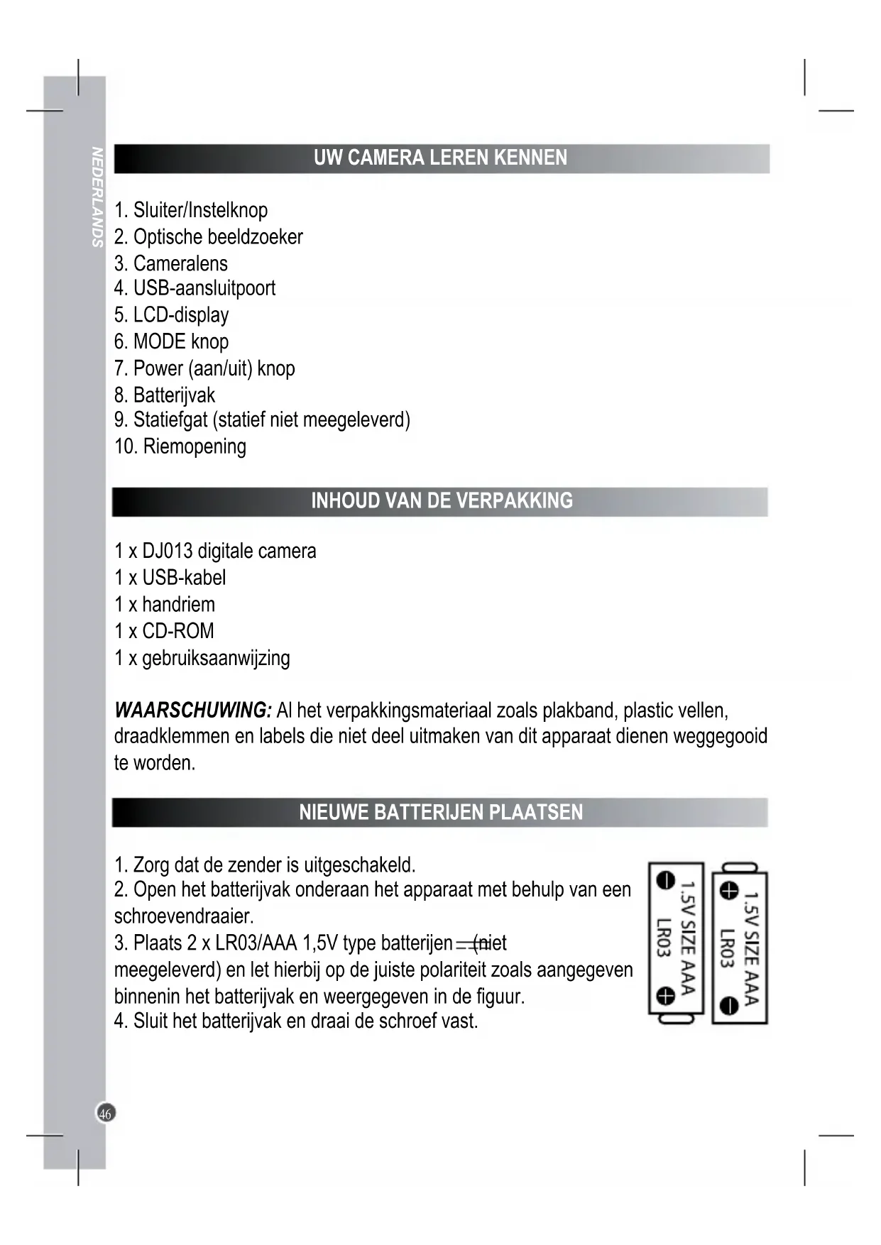 3. Plaats 2 x LR03/AAA 1,5V type batterijen (niet