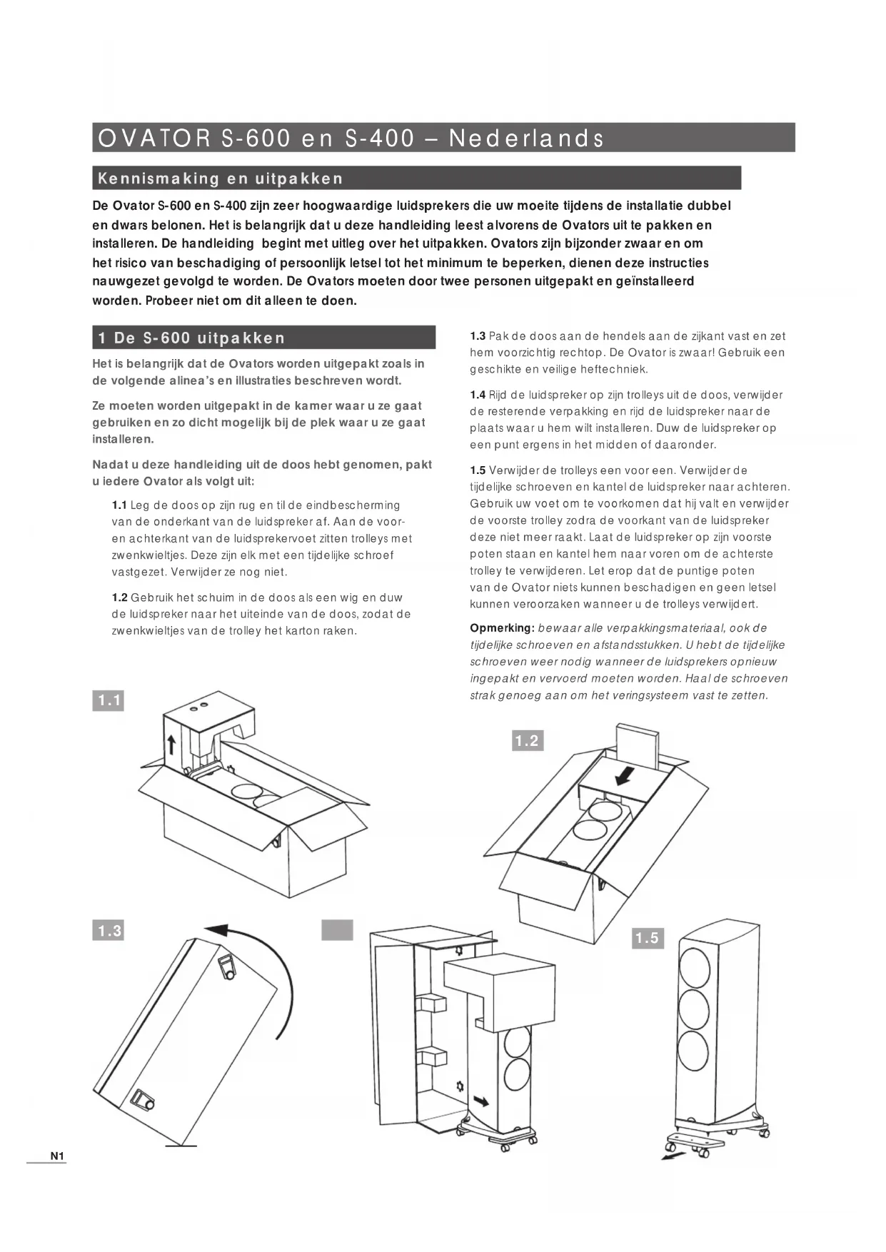 ENGLISH, DEUTSCH, FRANÇAIS, ITALIANO, ESPAñOL, NEDERLANDS, 中文N1 OVATOR S-600 en S-400 – Nederlands Kennismaking en uitpakken De Ovator S-600 en S-400 zijn zeer hoogwaardige luidsprekers die uw moeite tijdens de installatie dubbel en dwars belonen. Het is belangrijk dat u deze handleiding leest alvorens de Ovators uit te pakken en installeren. De handleiding begint met uitleg over het uitpakken. Ovators zijn bijzonder zwaar en om het risico van beschadiging of persoonlijk letsel tot het minimum te beperken, dienen deze instructies nauwgezet gevolgd te worden. De Ovators moeten door twee personen uitgepakt en geïnstalleerd worden. Probeer niet om dit alleen te doen. 1 De S-600 uitpakken Het is belangrijk dat de Ovators worden uitgepakt zoals in de volgende alinea’s en illustraties beschreven wordt. Ze moeten worden uitgepakt in de kamer waar u ze gaat gebruiken en zo dicht mogelijk bij de plek waar u ze gaat installeren. Nadat u deze handleiding uit de doos hebt genomen, pakt u iedere Ovator als volgt uit: 1.1 Leg de doos op zijn rug en til de eindbescherming van de onderkant van de luidspreker af. Aan de voor- en achterkant van de luidsprekervoet zitten trolleys met zwenkwieltjes. Deze zijn elk met een tijdelijke schroef vastgezet. Verwijder ze nog niet.1.2 Gebruik het schuim in de doos als een wig en duw de luidspreker naar het uiteinde van de doos, zodat de zwenkwieltjes van de trolley het karton raken.1.3 Pak de doos aan de hendels aan de zijkant vast en zet hem voorzichtig rechtop. De Ovator is zwaar! Gebruik een geschikte en veilige heftechniek.1.4 Rijd de luidspreker op zijn trolleys uit de doos, verwijder de resterende verpakking en rijd de luidspreker naar de plaats waar u hem wilt installeren. Duw de luidspreker op een punt ergens in het midden of daaronder.1.5 Verwijder de trolleys een voor een. Verwijder de tijdelijke schroeven en kantel de luidspreker naar achteren. Gebruik uw voet om te voorkomen dat hij valt en verwijder de voorste trolley zodra de voorkant van de luidspreker deze niet meer raakt. Laat de luidspreker op zijn voorste poten staan en kantel hem naar voren om de achterste trolley te verwijderen. Let erop dat de puntige poten van de Ovator niets kunnen beschadigen en geen letsel kunnen veroorzaken wanneer u de trolleys verwijdert.Opmerking: bewaar alle verpakkingsmateriaal, ook de tijdelijke schroeven en afstandsstukken. U hebt de tijdelijke schroeven weer nodig wanneer de luidsprekers opnieuw ingepakt en vervoerd moeten worden. Haal de schroeven strak genoeg aan om het veringsysteem vast te zetten.