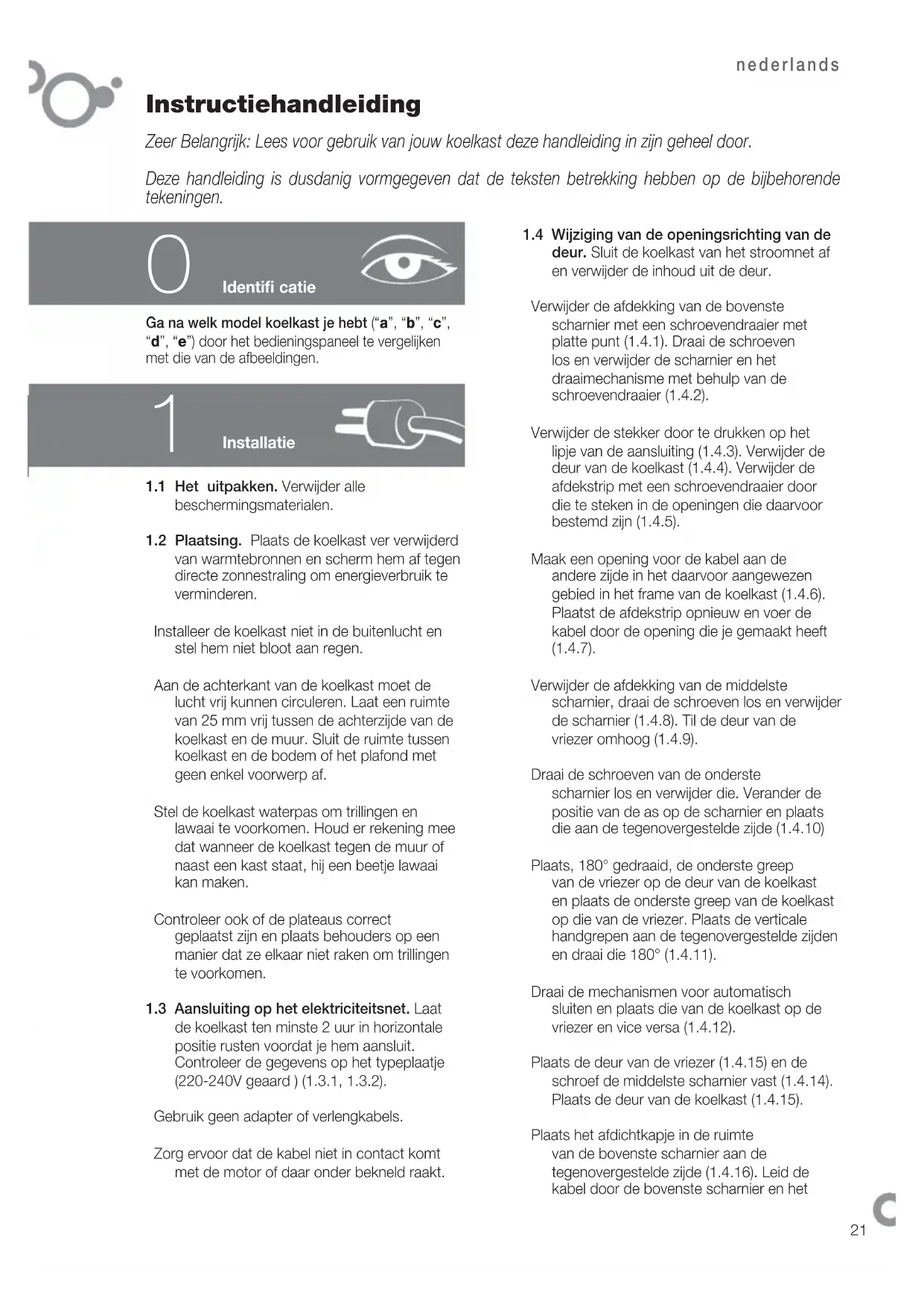 deur. Sluit de koelkast van het stroomnet af en verwijder de inhoud uit de deur. Verwijder de afdekking van de bovenste scharnier met een schroevendraaier met platte punt (1.4.1). Draai de schroeven los en verwijder de scharnier en het draaimechanisme met behulp van de schroevendraaier (1.4.2). Verwijder de stekker door te drukken op het lipje van de aansluiting (1.4.3). Verwijder de deur van de koelkast (1.4.4). Verwijder de afdekstrip met een schroevendraaier door die te steken in de openingen die daarvoor bestemd zijn (1.4.5). Maak een opening voor de kabel aan de andere zijde in het daarvoor aangewezen gebied in het frame van de koelkast (1.4.6). Plaatst de afdekstrip opnieuw en voer de kabel door de opening die je gemaakt heeft (1.4.7). Verwijder de afdekking van de middelste scharnier, draai de schroeven los en verwijder de scharnier (1.4.8). Til de deur van de vriezer omhoog (1.4.9). Draai de schroeven van de onderste scharnier los en verwijder die. Verander de positie van de as op de scharnier en plaats die aan de tegenovergestelde zijde (1.4.10) Plaats, 180° gedraaid, de onderste greep van de vriezer op de deur van de koelkast en plaats de onderste greep van de koelkast op die van de vriezer. Plaats de verticale handgrepen aan de tegenovergestelde zijden en draai die 180° (1.4.11). Draai de mechanismen voor automatisch sluiten en plaats die van de koelkast op de vriezer en vice versa (1.4.12). Plaats de deur van de vriezer (1.4.15) en de schroef de middelste scharnier vast (1.4.14). Plaats de deur van de koelkast (1.4.15). Plaats het afdichtkapje in de ruimte van de bovenste scharnier aan de tegenovergestelde zijde (1.4.16). Leid de kabel door de bovenste scharnier en hetnederlands