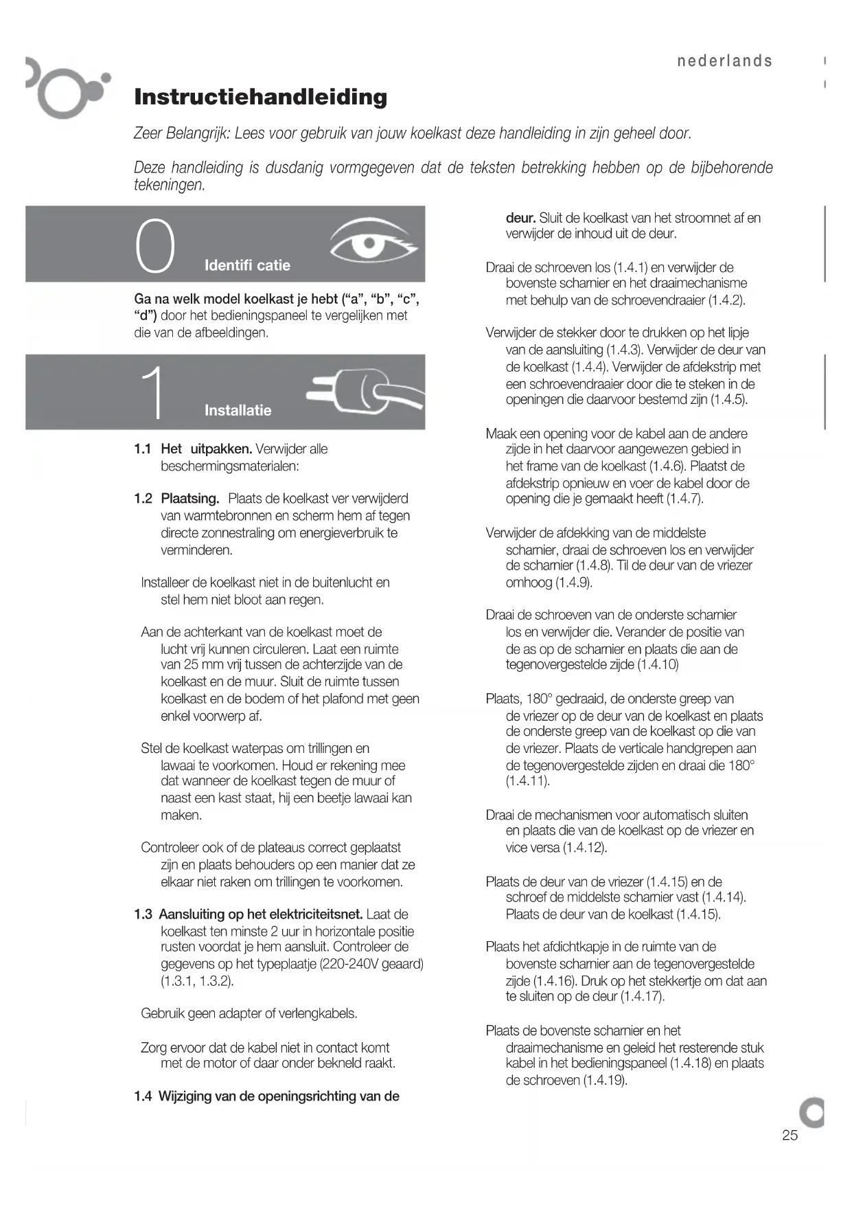 Identifi catie deur. Sluit de koelkast van het stroomnet af en verwijder de inhoud uit de deur. Draai de schroeven los (1.4.1) en verwijder de bovenste scharnier en het draaimechanisme met behulp van de schroevendraaier (1.4.2). Verwijder de stekker door te drukken op het lipje van de aansluiting (1.4.3). Verwijder de deur van de koelkast (1.4.4). Verwijder de afdekstrip met een schroevendraaier door die te steken in de openingen die daarvoor bestemd zijn (1.4.5). Maak een opening voor de kabel aan de andere zijde in het daarvoor aangewezen gebied in het frame van de koelkast (1.4.6). Plaatst de afdekstrip opnieuw en voer de kabel door de opening die je gemaakt heeft (1.4.7). Verwijder de afdekking van de middelste scharnier, draai de schroeven los en verwijder de scharnier (1.4.8). Til de deur van de vriezer omhoog (1.4.9). Draai de schroeven van de onderste scharnier los en verwijder die. Verander de positie van de as op de scharnier en plaats die aan de tegenovergestelde zijde (1.4.10) Plaats, 180° gedraaid, de onderste greep van de vriezer op de deur van de koelkast en plaats de onderste greep van de koelkast op die van de vriezer. Plaats de verticale handgrepen aan de tegenovergestelde zijden en draai die 180° (1.4.11). Draai de mechanismen voor automatisch sluiten en plaats die van de koelkast op de vriezer en vice versa (1.4.12). Plaats de deur van de vriezer (1.4.15) en de schroef de middelste scharnier vast (1.4.14). Plaats de deur van de koelkast (1.4.15). Plaats het afdichtkapje in de ruimte van de bovenste scharnier aan de tegenovergestelde zijde (1.4.16). Druk op het stekkertje om dat aan te sluiten op de deur (1.4.17). Plaats de bovenste scharnier en het draaimechanisme en geleid het resterende stuk kabel in het bedieningspaneel (1.4.18) en plaats de schroeven (1.4.19).nederlands