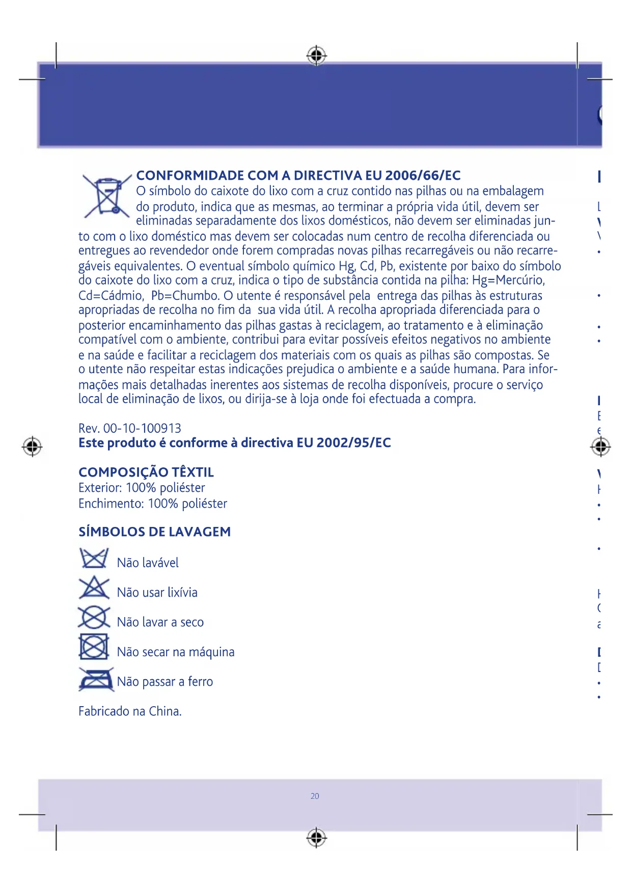 Dit product is conform de EU-richtlijn 2002/95/EG SAMENSTELLING STOF Buitenkant: 100% polyester