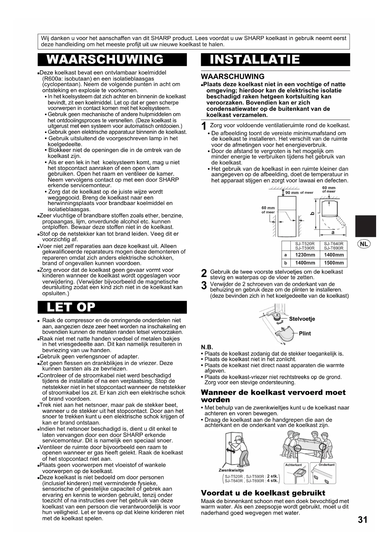 Wij danken u voor het aanschaffen van dit SHARP product. Lees voordat u uw SHARP koelkast in gebruik neemt eerst deze handleiding om het meeste profijt uit uw nieuwe koelkast te halen.