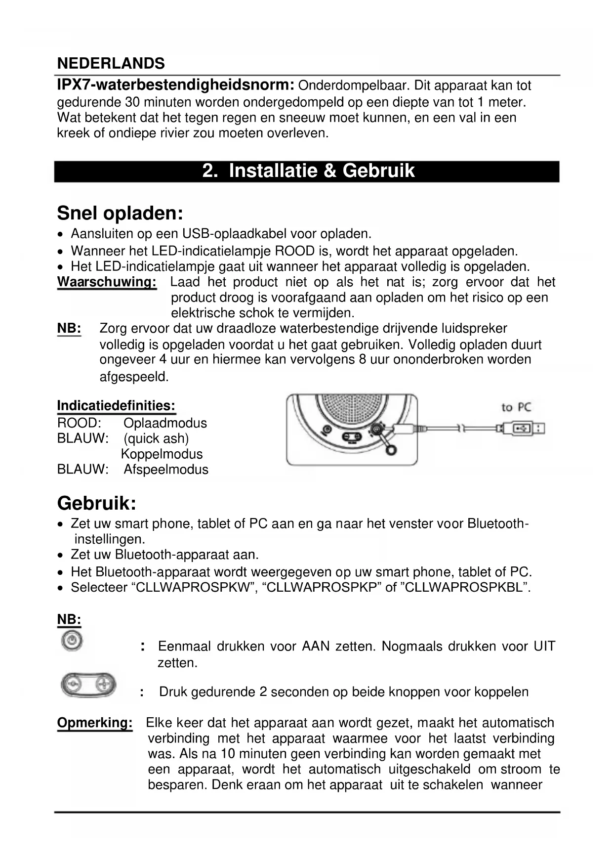 Snel opladen: Aansluiten op een USB-oplaadkabel voor opladen. Wanneer het LED-indicatielampje ROOD is, wordt het apparaat opgeladen. Het LED-indicatielampje gaat uit wanneer het apparaat volledig is opgeladen. Waarschuwing: Laad het product niet op als het nat is; zorg ervoor dat het product droog is voorafgaand aan opladen om het risico op een elektrische schok te vermijden. NB: Zorg ervoor dat uw draadloze waterbestendige drijvende luidspreker volledig is opgeladen voordat u het gaat gebruiken. Volledig opladen duurt ongeveer 4 uur en hiermee kan vervolgens 8 uur ononderbroken worden afgespeeld. Indicatiedefinities: ROOD: Oplaadmodus BLAUW: (quick ash) Koppelmodus BLAUW: Afspeelmodus Gebruik: Zet uw smart phone, tablet of PC aan en ga naar het venster voor Bluetooth- instellingen. Zet uw Bluetooth-apparaat aan. Het Bluetooth-apparaat wordt weergegeven op uw smart phone, tablet of PC. Selecteer “CLLWAPROSPKW”, “CLLWAPROSPKP” of ”CLLWAPROSPKBL”. NB: : Eenmaal drukken voor AAN zetten. Nogmaals drukken voor UIT zetten. : Druk gedurende 2 seconden op beide knoppen voor koppelen Opmerking: Elke keer dat het apparaat aan wordt gezet, maakt het automatisch verbinding met het apparaat waarmee voor het laatst verbinding was. Als na 10 minuten geen verbinding kan worden gemaakt met een apparaat, wordt het automatisch uitgeschakeld om stroom te besparen. Denk eraan om het apparaat uit te schakelen wanneerNEDERLANDS het niet wordt gebruikt om zo stroom te besparen. Beantwoorden van inkomende gesprekken: Als u een oproep ontvangt terwijl u luistert naar muziek via de luidspreker, wordt de muziek gepauzeerd. Na het verwerken van het inkomende gesprek, speelt de muziek weer door.NEDERLANDS