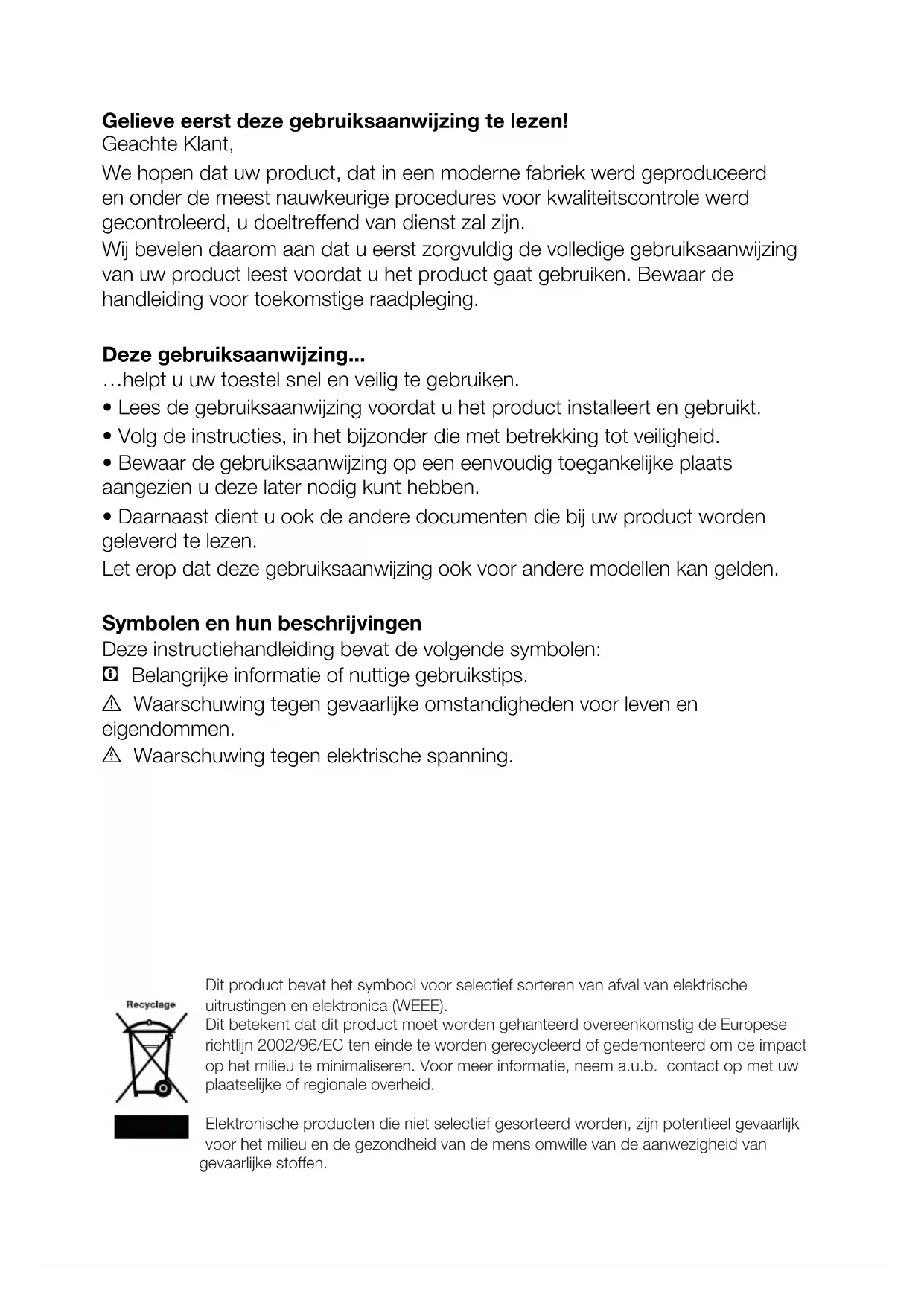 - Daarnaast dient u ook de andere documenten die bij uw product worden geleverd te lezen. Let erop dat deze gebruiksaanwijzing ook voor andere modellen kan gelden. Symbolen en hun beschrijvingen Deze instructiehandleiding bevat de volgende symbolen: C Belangrijke informatie of nuttige gebruikstips. A Waarschuwing tegen gevaarlijke omstandigheden voor leven en eigendommen. B Waarschuwing tegen elektrische spanning. Dit product bevat het symbool voor selectief sorteren van afval van elektrische uitrustingen en elektronica (WEEE). Dit betekent dat dit product moet worden gehanteerd overeenkomstig de Europese richtlijn 2002/96/EC ten einde te worden gerecycleerd of gedemonteerd om de impact op het milieu te minimaliseren. Voor meer informatie, neem a.u.b. contact op met uw plaatselijke of regionale overheid. Elektronische producten die niet selectief gesorteerd worden, zijn potentieel gevaarlijk voor het milieu en de gezondheid van de mens omwille van de aanwezigheid van gevaarlijke stoffen.FL