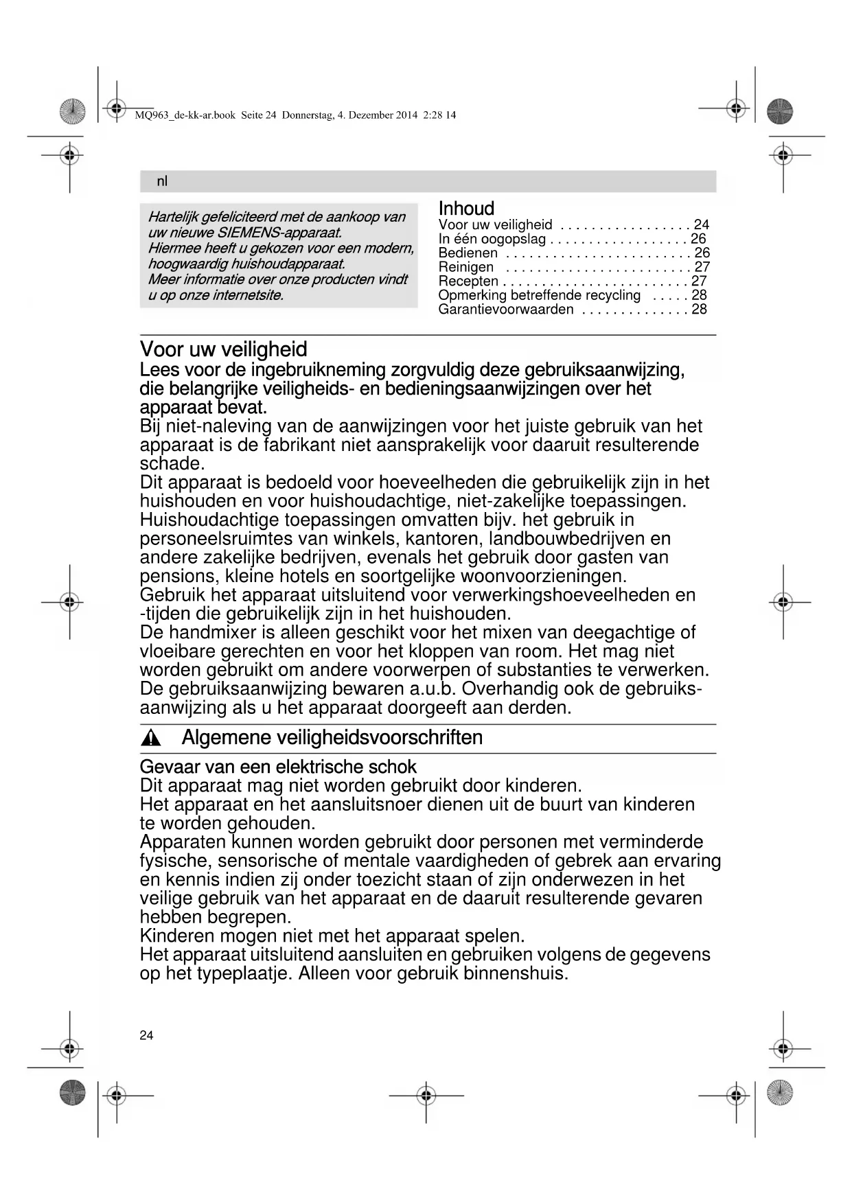 Inhoud Voor uw veiligheid . . . . . . . . . . . . . . . . . 24In één oogopslag . . . . . . . . . . . . . . . . . . 26Bedienen . . . . . . . . . . . . . . . . . . . . . . . . 26Reinigen . . . . . . . . . . . . . . . . . . . . . . . . 27Recepten . . . . . . . . . . . . . . . . . . . . . . . . 27Opmerking betreffende recycling . . . . . 28Garantievoorwaarden . . . . . . . . . . . . . . 28 Voor uw veiligheid