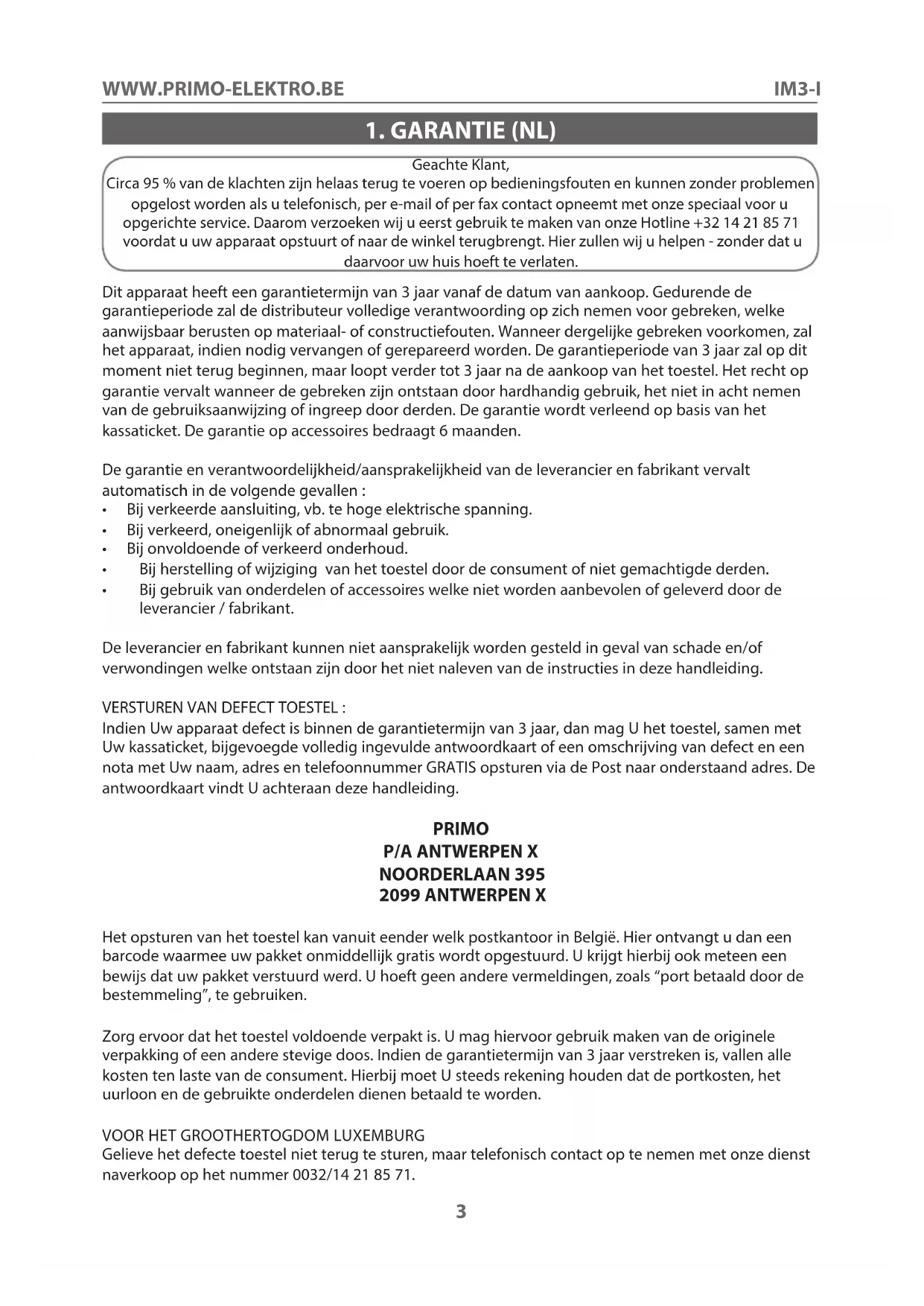 - Bij gebruik van onderdelen of accessoires welke niet worden aanbevolen of geleverd door de leverancier / fabrikant. De leverancier en fabrikant kunnen niet aansprakelijk worden gesteld in geval van schade en/of verwondingen welke ontstaan zijn door het niet naleven van de instructies in deze handleiding. VERSTUREN VAN DEFECT TOESTEL : Indien Uw apparaat defect is binnen de garantietermijn van 3 jaar, dan mag U het toestel, samen met Uw kassaticket, bijgevoegde volledig ingevulde antwoordkaart of een omschrijving van defect en een nota met Uw naam, adres en telefoonnummer GRATIS opsturen via de Post naar onderstaand adres. De antwoordkaart vindt U achteraan deze handleiding. PRIMO