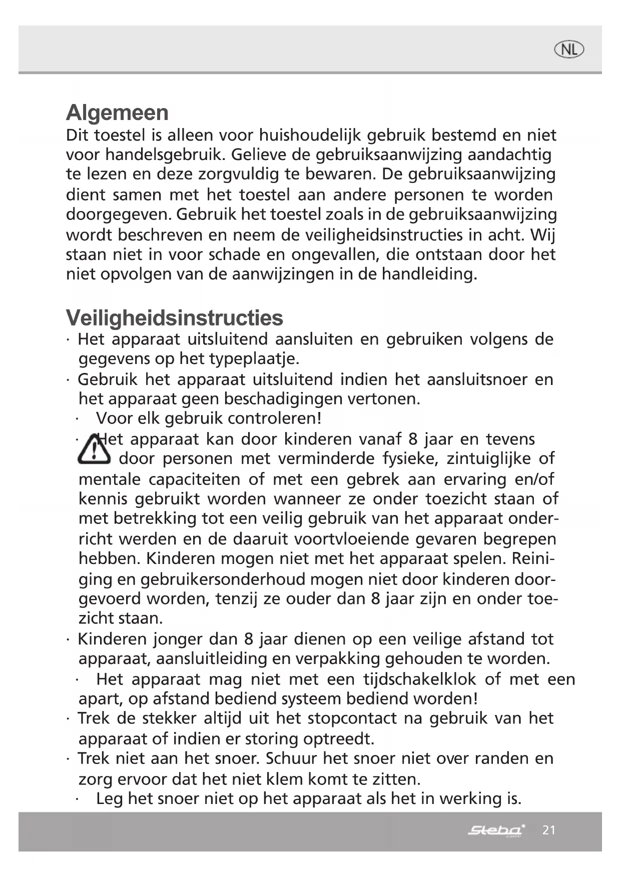 Avant le premier usage Graisser légèrement la surface de cuisson une fois avant le premier usage. Puis faire chauffer l’appareil dix minutes en fermant les surfaces de cuisson sans pièce à griller et en réglant le thermostat sur la position maximale. Essuyer ensuite les plaques avec un chiffon humide. Préparation de plats ∙ Raccordez l’appareil comme indiqué sur la plaque signalétique. product graphics FG 70 | 09.02.2012 © GESTALTUNGSWESEN any unauthorised use is prohibited product graphics FG 70 | power button printdata attached as *.ai and *.pdf color: white as in product sample - La lampe rouge allumée indique que l’appareil est raccordé. Si vous tournez le sélecteur de température. ∙ Lorsqu’on chauffe l’appareil pour la première fois, il est possible qu’un peu de fumée se dégage. Ces désagréments disparaîtront après quelques minutes. ∙ Préchauffez l’appareil avec le couvercle fermé jusqu’à ce que la lampe verte est allumée. ∙ avez maintenant la température souhaitée. ∙ Mettez les mets dans l’appareil est fermez le couvercle. ∙ Pendant le temps de cuisson, il est possible que la lampe verte s’éteigne et s’allume encore. Le thermostat travaille ∙ Retirez les mets avec une spatule en bois ou en plastique pour ne pas endommager l’anti-adhésif ∙ Pour ne pas perdre de la chaleur fermez toujours le couvercle. ∙ Si la lampe verte est allumée on peut de nouveau mettre la grillade ∙ Le temps de cuisson et la température dépendent de : La qualité et de l’épaisseur des aliments ainsi que de la cuisson souhaitée Attention: Il est possible que de la vapeur des aliments s’échappe entre les plaques. Danger de brûlures !20 Réglage de température product graphics FG 70 | 09.02.2012 © GESTALTUNGSWESEN any unauthorised use is prohibited product graphics FG 70 | switch printdata attached as *.ai and *.pdf color: white as in product sample 150°C 180°C 200°C 220°C 140° C cuire délicatement pour volailles, après avoir saisi sur 150° C légumes Cuire délicatement pour viande, après avoir saisi sur 220°180° C pour saisir volailles/fruits de mer/gibier220° C pour saisir viande blanche et rouge. Evacuation correcte de ce produit: Rendre les appareils ayant fait leur temps immédiatement inutilisables Au sein de l’EU, ce symbole indique que ce produit ne doit pas être évacué avec les déchets mécaniques. Les vieux appareils contiennent des matériaux qui peuvent être recyclés et qui devraient être déposés à des centres de récu-pération et afin de ne pas altérer l’environnement, voire la santé des personnes par une élimintation des déchets non-contrôlée. Veuillez donc évacuer les appareils usés par des systèmes de collecte bien appropriés ou envoyez-lea opoù vous l’avez acheté en vue d’évacuation. L’appareil sera alors amené à la récupération des matériaux. Service Après-Vente: Si contre toute attente, votre appareil devait avoir besoin du SAV, veuillez alors vous adres-ser à l’adresse suivante. Nous en organiserons alors d’enlèvement. Des paquets non affranchis ne pourront pas être pris en charge.STEBA Elektrogeräte GmbH & Co KGPointstr. 2, 96129 Strullendorf / GermanyDistribution-Tél.:09543/449-17/-18,Service-Tél.:09543/449-44,Fax:09543/449-19 e-Mail: elektro@steba.com Internet: http://www.steba.com Attention! Les appareils électriques ne seront réparés que par du personnel électricien qualifié étant donné que des réparations non-conformes peuvent avoir des conséquences graves.21 Algemeen Dit toestel is alleen voor huishoudelijk gebruik bestemd en niet voor handelsgebruik. Gelieve de gebruiksaanwijzing aandachtig te lezen en deze zorgvuldig te bewaren. De gebruiksaanwijzing dient samen met het toestel aan andere personen te worden doorgegeven. Gebruik het toestel zoals in de gebruiksaanwijzing wordt beschreven en neem de veiligheidsinstructies in acht. Wij staan niet in voor schade en ongevallen, die ontstaan door het niet opvolgen van de aanwijzingen in de handleiding. Veiligheidsinstructies ∙ Het apparaat uitsluitend aansluiten en gebruiken volgens de gegevens op het typeplaatje. ∙ Gebruik het apparaat uitsluitend indien het aansluitsnoer en het apparaat geen beschadigingen vertonen. ∙ Voor elk gebruik controleren! ∙ Het apparaat kan door kinderen vanaf 8 jaar en tevens door personen met verminderde fysieke, zintuiglijke of mentale capaciteiten of met een gebrek aan ervaring en/of kennis gebruikt worden wanneer ze onder toezicht staan of met betrekking tot een veilig gebruik van het apparaat onder- richt werden en de daaruit voortvloeiende gevaren begrepen hebben. Kinderen mogen niet met het apparaat spelen. Reini- ging en gebruikersonderhoud mogen niet door kinderen door- gevoerd worden, tenzij ze ouder dan 8 jaar zijn en onder toe- zicht staan. ∙ Kinderen jonger dan 8 jaar dienen op een veilige afstand tot apparaat, aansluitleiding en verpakking gehouden te worden. ∙ Het apparaat mag niet met een tijdschakelklok of met een apart, op afstand bediend systeem bediend worden! ∙ Trek de stekker altijd uit het stopcontact na gebruik van het apparaat of indien er storing optreedt. ∙ Trek niet aan het snoer. Schuur het snoer niet over randen en zorg ervoor dat het niet klem komt te zitten. ∙ Leg het snoer niet op het apparaat als het in werking is.22 ∙ Houd altijd toezicht op het apparaat tijdens gebruik. ∙ Zet geen voorwerpen op het apparaat. ∙ Bewaar het apparaat niet buiten. ∙ Dompel het apparaat niet in water. ∙ Gebruik het apparaat nooit na verkeerd gebruik, bijvoorbeeld wanneer het apparaat is gevallen of op een andere manier is beschadigd. ∙ De fabrikant is niet verantwoordelijk voor de gevolgen van ver- keerd gebruik die door het niet respecteren van de gebruik- saanwijzing zijn veroorzaakt. ∙ Het apparaat wordt heet. Pas transporteren wanneer het is af- gekoeld! ∙ Om gevaren te vermijden mogen reparaties aan het app