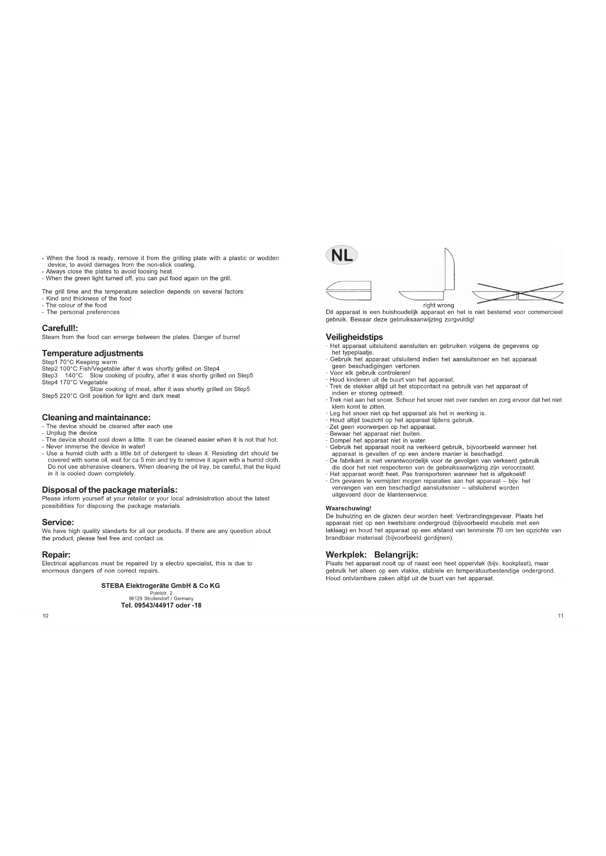 - Maak het apparaat schoon met een vochtige doek. Breng met een penseel wat olie aan op hardnekkige resten, laat het apparaat 5 minuten met rust en maak het vervolgens nog een keer schoon met een vochtige doek. Gebruik geen schuurmiddelen. Let er bij het schoonmaken van de vetopvang op dat de vloeistof die zich daarin bevindt is afgekoeld. Afgifte van verpakking en oud apparaat Vraag bij uw speciaalzaak of bij uw gemeente om actuele informatie over de afgifte van de verpakking en van uw oude apparaat. Garantie Voor dit apparaat gelden de garantievoorwaarden die worden uitgegeven door de duitse gebruiksaanwijzing. STEBA Elektrogeräte GmbH & Co KG Pointstr. 2 96129 Strullendorf / Germany Tel. 09543/44917 oder -18 Voor het eerste gebruik Vet de grilleerplaten voor het eerste gebruik een keer licht in. Warm vervolgens het apparaat met gesloten grilleerplaten zonder grilleerproducten op de maximale stand 10 minuten op. Wis de platen daarna met een vochtige doek af. Gebruik geen agressieve schoonmaakmiddelen om beschadiging van de anti-aanbaklaag te voor- komen. Toebereiden van gerechten