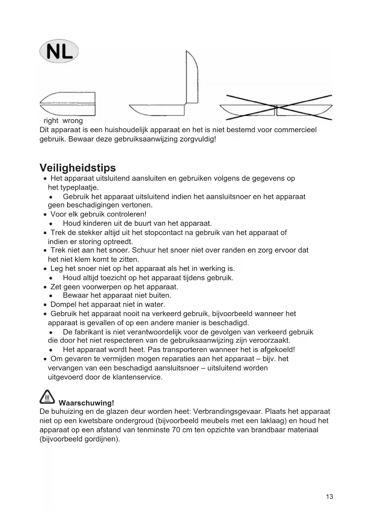 De buhuizing en de glazen deur worden heet: Verbrandingsgevaar. Plaats het apparaat Niet op een kwetsbare ondergroud (bijvoorbeeld meubels met een laklaag) en houd het apparaat op een afstand van tenminste 70~cm ten opzichte van brandhaar materiaal (bijvoorbeeld gordijnen).