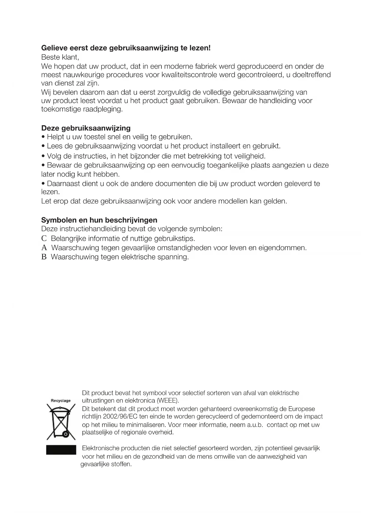 - Daarnaast dient u ook de andere documenten die bij uw product worden geleverd te lezen. Let erop dat deze gebruiksaanwijzing ook voor andere modellen kan gelden. Symbolen en hun beschrijvingen Deze instructiehandleiding bevat de volgende symbolen: C Belangrijke informatie of nuttige gebruikstips. A Waarschuwing tegen gevaarlijke omstandigheden voor leven en eigendommen. B Waarschuwing tegen elektrische spanning. Dit product bevat het symbool voor selectief sorteren van afval van elektrische uitrustingen en elektronica (WEEE). Dit betekent dat dit product moet worden gehanteerd overeenkomstig de Europese richtlijn 2002/96/EC ten einde te worden gerecycleerd of gedemonteerd om de impact op het milieu te minimaliseren. Voor meer informatie, neem a.u.b. contact op met uw plaatselijke of regionale overheid. Elektronische producten die niet selectief gesorteerd worden, zijn potentieel gevaarlijk voor het milieu en de gezondheid van de mens omwille van de aanwezigheid van gevaarlijke stoffen.NL