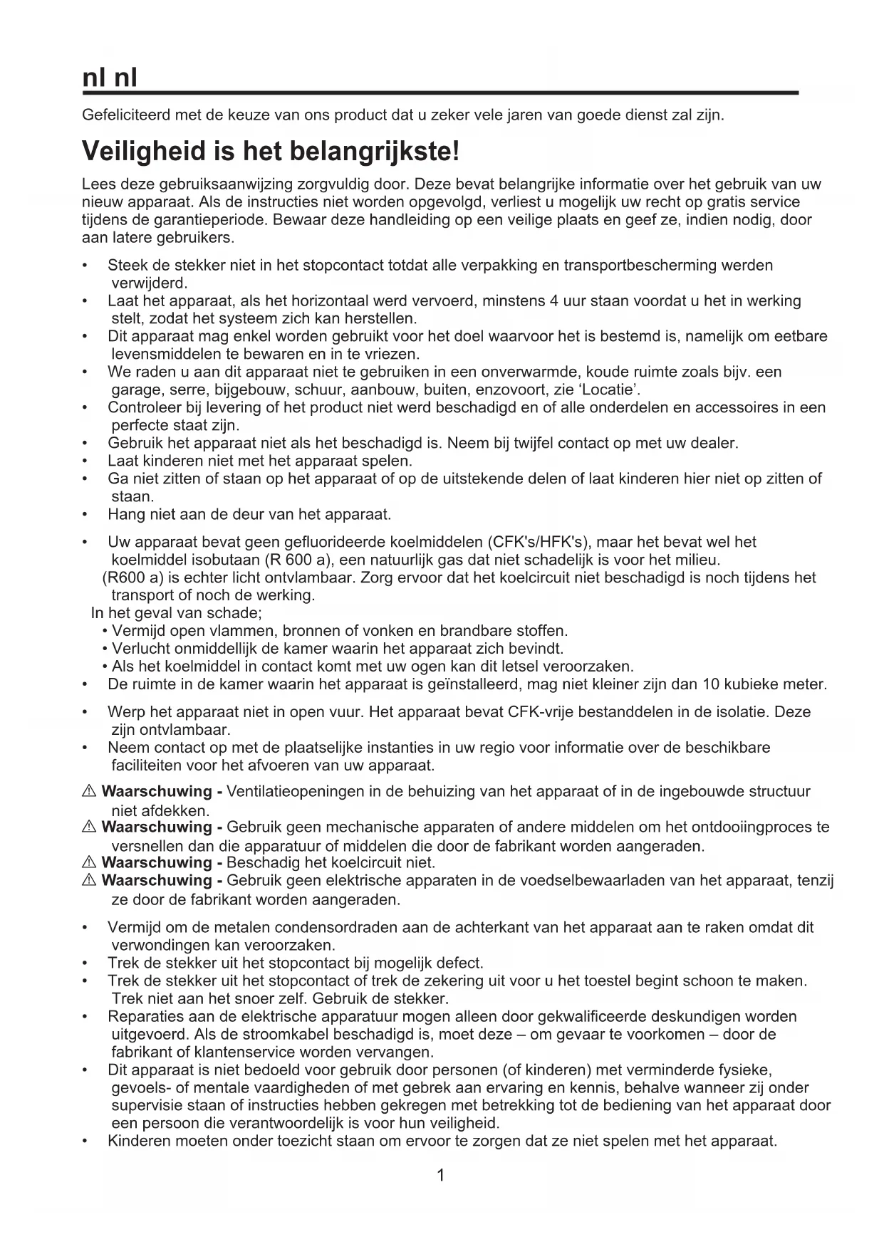 - Uwapparaatbevatgeengefluorideerdekoelmiddelen(CFK's/HFK's),maarhetbevatwelhet koelmiddelisobutaan(R600a),eennatuurlijkgasdatnietschadelijkisvoorhetmilieu. (R600a)isechterlichtontvlambaar.Zorgervoordathetkoelcircuitnietbeschadigdisnochtijdenshet transport of noch de werking. In het geval van schade;