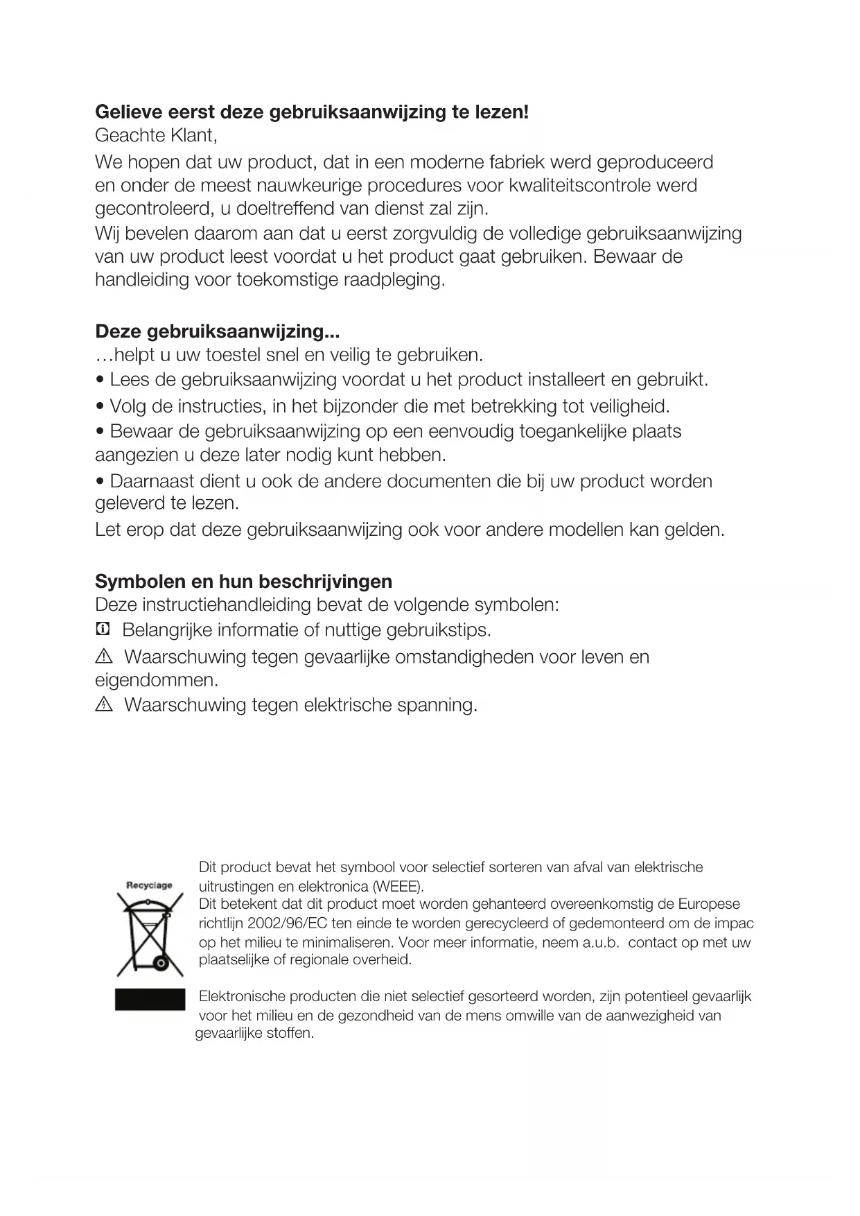 - Daarnaast dient u ook de andere documenten die bij uw product worden geleverd te lezen. Let erop dat deze gebruiksaanwijzing ook voor andere modellen kan gelden. Symbolen en hun beschrijvingen Deze instructiehandleiding bevat de volgende symbolen: C Belangrijke informatie of nuttige gebruikstips. A Waarschuwing tegen gevaarlijke omstandigheden voor leven en eigendommen. B Waarschuwing tegen elektrische spanning. Dit product bevat het symbool voor selectief sorteren van afval van elektrische uitrustingen en elektronica (WEEE). Dit betekent dat dit product moet worden gehanteerd overeenkomstig de Europese richtlijn 2002/96/EC ten einde te worden gerecycleerd of gedemonteerd om de impact op het milieu te minimaliseren. Voor meer informatie, neem a.u.b. contact op met uw plaatselijke of regionale overheid. Elektronische producten die niet selectief gesorteerd worden, zijn potentieel gevaarlijk voor het milieu en de gezondheid van de mens omwille van de aanwezigheid van gevaarlijke stoffen.FL