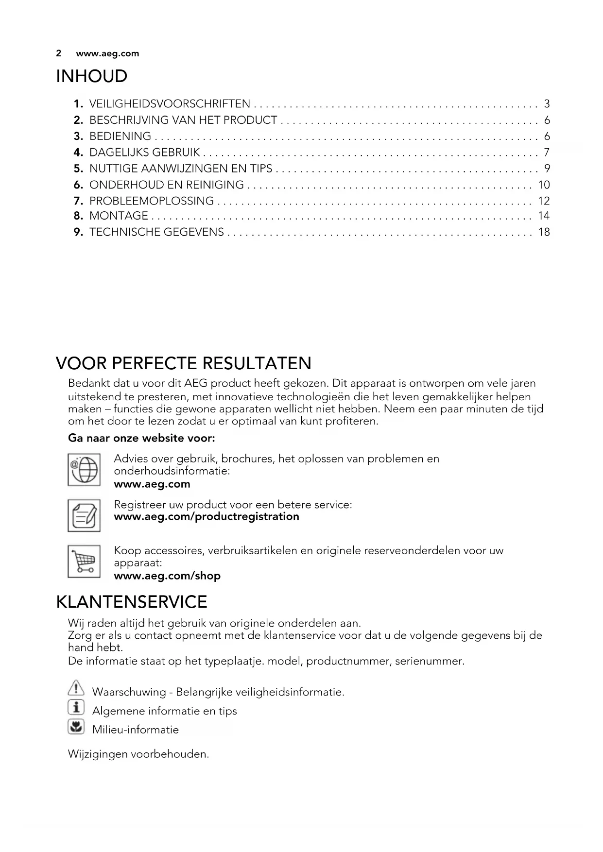 Bedankt dat u voor dit AEG product heeft gekozen. Dit apparaat is ontworpen om vele jaren uitstekend te presteren, met innovatieve technologieën die het leven gemakkelijker helpen maken – functies die gewone apparaten wellicht niet hebben. Neem een paar minuten de tijd om het door te lezen zodat u er optimaal van kunt profiteren. Ga naar onze website voor: Advies over gebruik, brochures, het oplossen van problemen en onderhoudsinformatie: www.aeg.com Registreer uw product voor een betere service: www.aeg.com/productregistration Koop accessoires, verbruiksartikelen en originele reserveonderdelen voor uw apparaat: www.aeg.com/shop KLANTENSERVICE Wij raden altijd het gebruik van originele onderdelen aan. Zorg er als u contact opneemt met de klantenservice voor dat u de volgende gegevens bij de hand hebt. De informatie staat op het typeplaatje. model, productnummer, serienummer. Waarschuwing - Belangrijke veiligheidsinformatie. Algemene informatie en tips Milieu-informatie Wijzigingen voorbehouden.