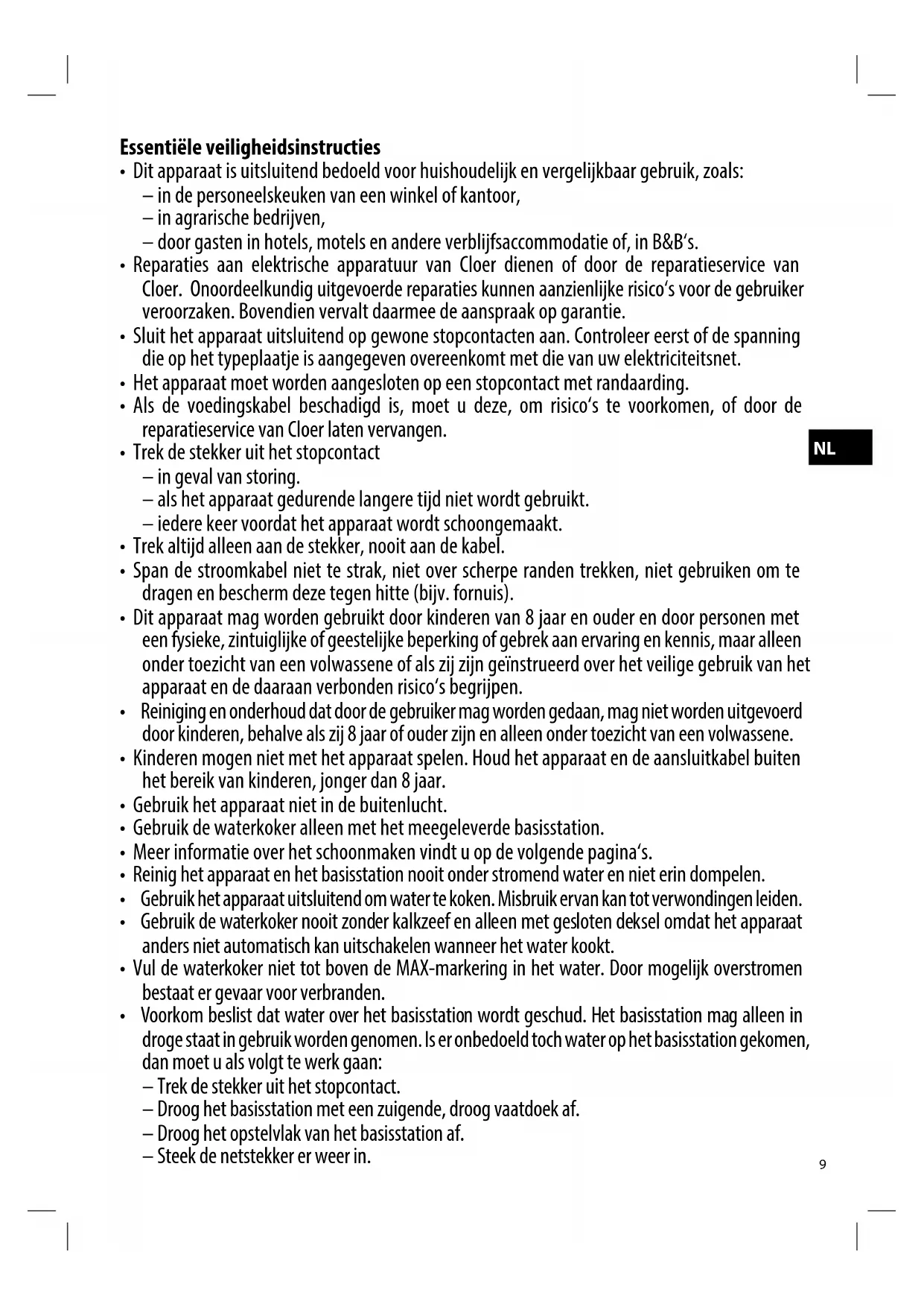 Elektrische apparaten van Cloer voldoen aan de geldende Europese richtlijnen en veiligheidsvoorschriften. Als uw Cloer-apparaat onverhoopt defect is of Niet goed werkt, neem dan contact op met de verkoper. Geregistreeerde klanten+kunnen ook gebruik maken van de diensten van de reparationservice van Cloer.