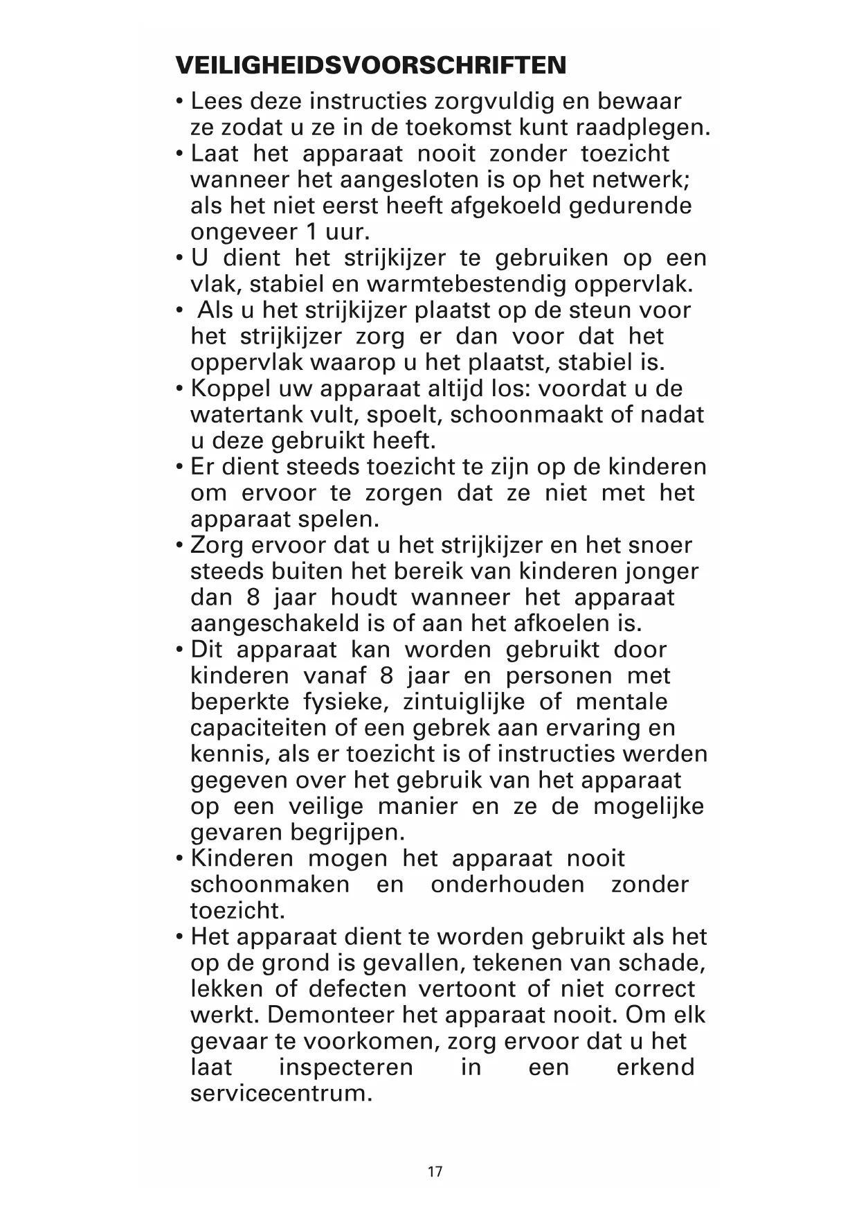 • Dompel uw stoomstrijkijzer nooit onder in water of een andere vloeistof. Houd het nooit