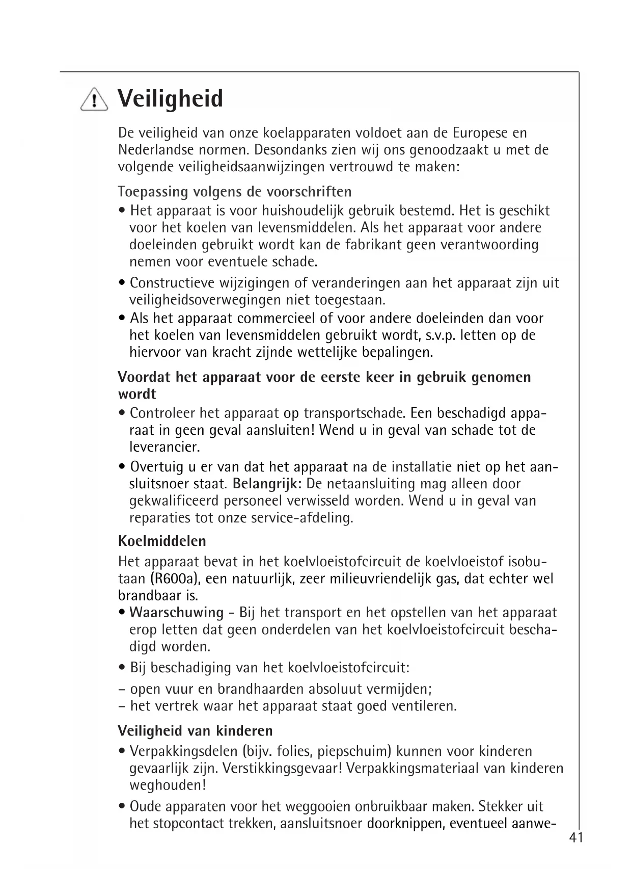 - Vaktermen Veiligheid De veiligheid van onze koelapparaten voldoet aan de Europese en Nederlandse normen. Desondanks zien wij ons genoodzaakt u met de volgende veiligheidsaanwijzingen vertrouwd te maken: Toepassing volgens de voorschriften p. 5641