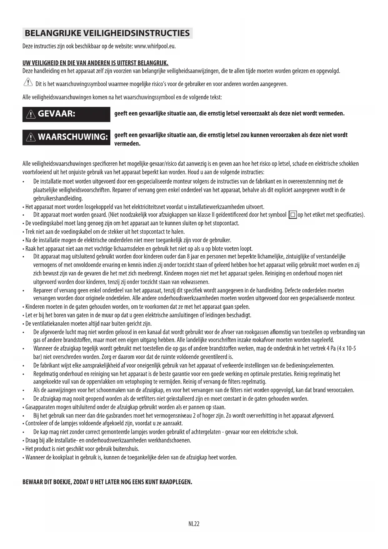 - Wanneer de kookplaat in gebruik is, kunnen de toegankelijke delen van de afzuigkap heet worden. BEWAAR DIT BOEKJE, ZODAT U HET LATER NOG EENS KUNT RAADPLEGEN. WAARSCHUWING: GEVAAR: NL22NL23 Controleer het apparaat, nadat u het hebt uitgepakt, op eventuele transportschade. Neem in geval van problemen contact op met de dealer of de dichtstbijzijnde Klantenservice. Om eventuele schade te voorkomen wordt geadviseerd om de oven pas vlak voor de installatie van de piepschuim bodem te halen.