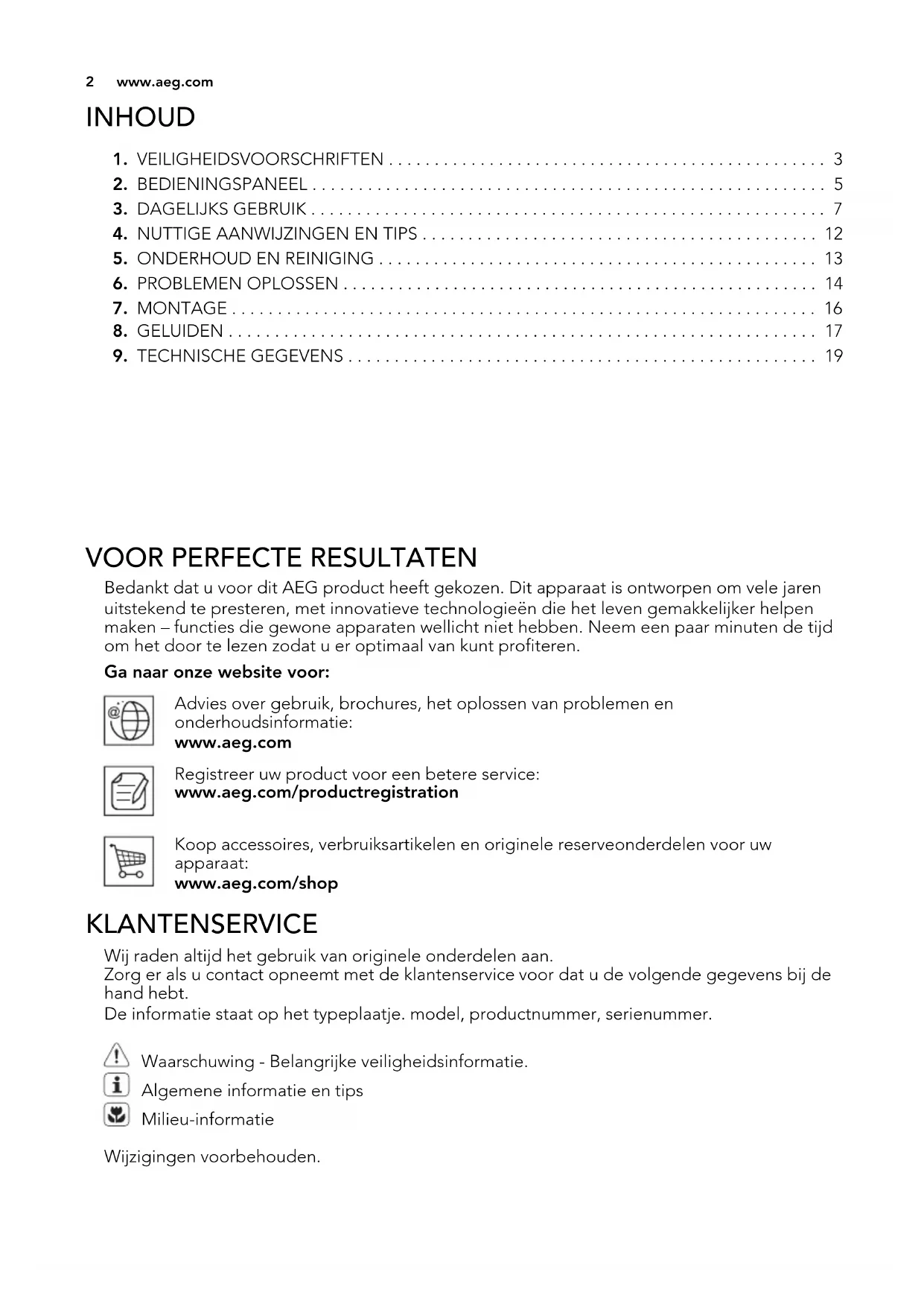 VOOR PERFECTE RESULTATEN Bedankt dat u voor dit AEG product heeft gekozen. Dit apparaat is ontworpen om vele jaren
