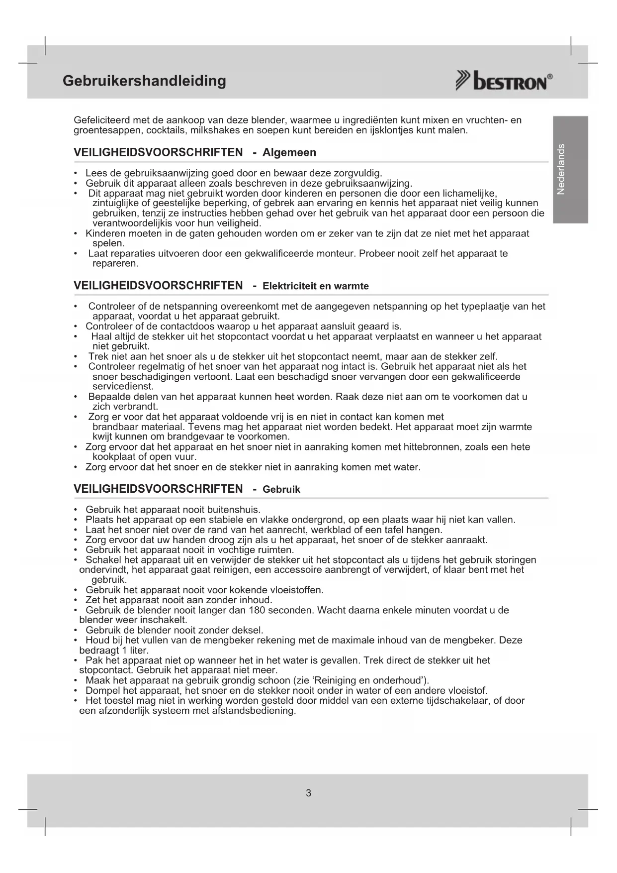 Nederlands Gefeliciteerd met de aankoop van deze blender, waarmee u ingrediënten kunt mixen en vruchten- en groentesappen, cocktails, milkshakes en soepen kunt bereiden en ijsklontjes kunt malen. VEILIGHEIDSVOORSCHRIFTEN - Algemeen