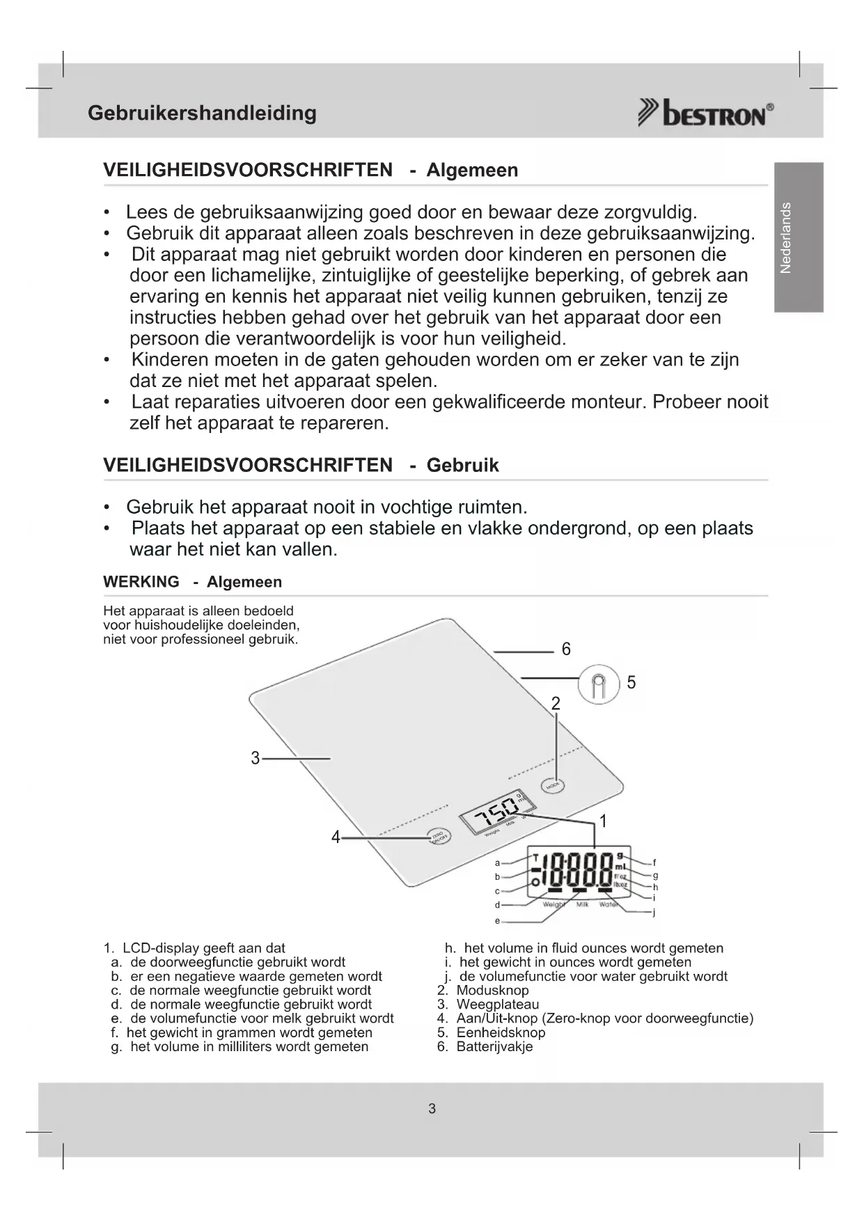 1. LCD-display geeft aan dat a. de doorweegfunctie gebruikt wordt b. er een negatieve waarde gemeten wordt c. de normale weegfunctie gebruikt wordt d. de normale weegfunctie gebruikt wordt e. de volumefunctie voor melk gebruikt wordt f. het gewicht in grammen wordt gemeten g. het volume in milliliters wordt gemeten h. het volume in fluid ounces wordt gemeten i. het gewicht in ounces wordt gemeten j. de volumefunctie voor water gebruikt wordt2. Modusknop3. Weegplateau4. Aan/Uit-knop (Zero-knop voor doorweegfunctie)5. Eenheidsknop6. BatterijvakjeGebruikershandleiding