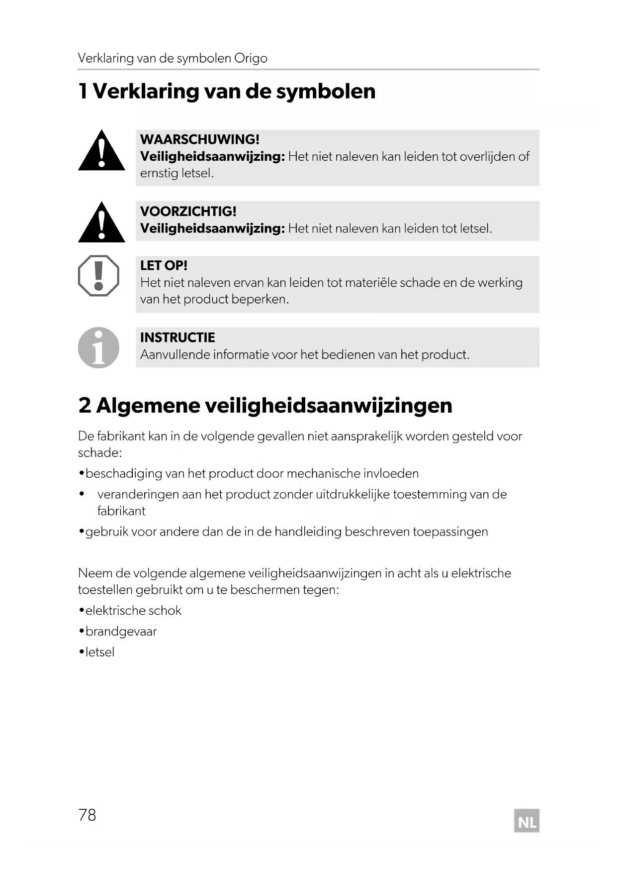 Origo_2000_4100.book Seite 78 Freitag, 6. Januar 2017 11:40 11NL Origo Algemene veiligheidsaanwijzingen