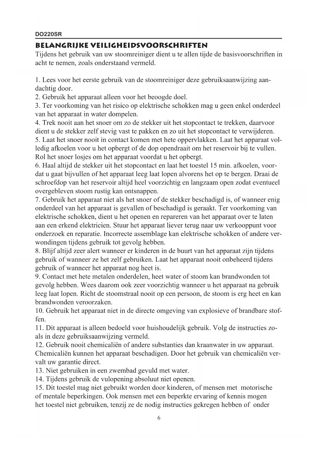 of mentale beperkingen. Ook mensen met een beperkte ervaring of kennis mogen het toestel niet gebruiken, tenzij ze de nodig instructies gekregen hebben of onder 6DO220SR toezicht van mensen begaan met hun veiligheid.