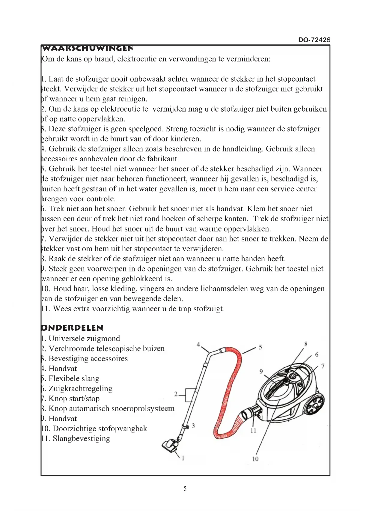 5DO-7242S VOORZORGSMAATREGELEN Wanneer de zuigmond of buis geblokkeerd is, moet u onmiddellijk de stofzuiger