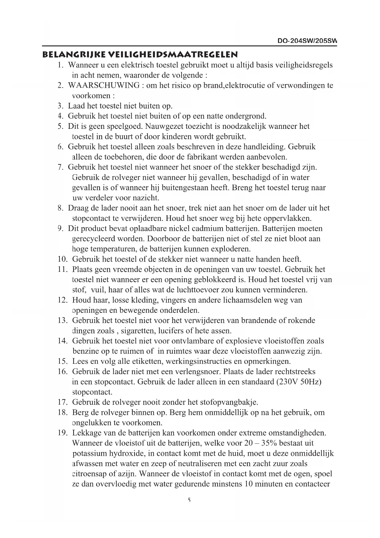 HANDLEIDING MODE D’EMPLOI GEBRAUCHANLEITUNG INSTRUCTION BOOKLET PRODUCT OF ROLVEGER BALAI ELECTRIQUE ROLLBÜRSTE SWEEPER DO-204SW/205SWDO-204SW/205SW GARANTIEVOORWAARDEN Dit apparaat heeft een garantietermijn van 2 jaar vanaf de datum van aankoop.