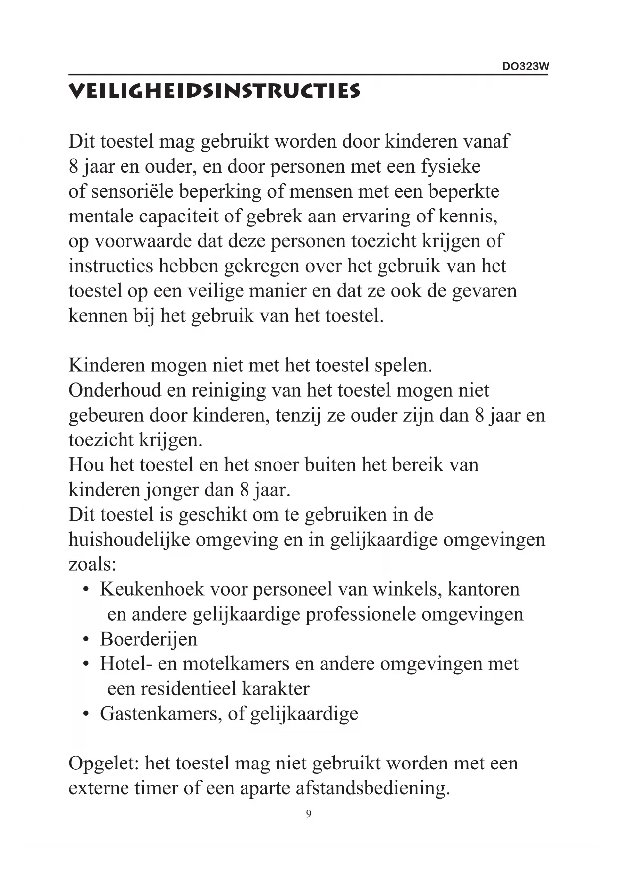 - Gastenkamers, of gelijkaardige Opgelet: het toestel mag niet gebruikt worden met een externe timer of een aparte afstandsbediening.DO323W